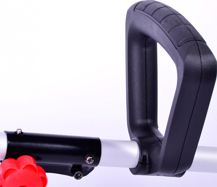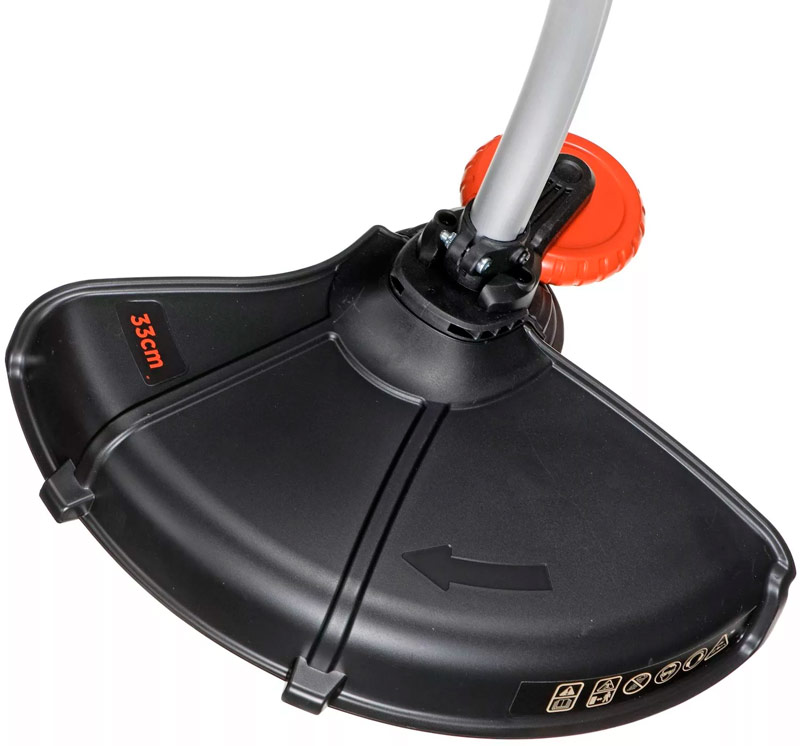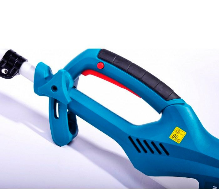 La tondeuse est faite sur une barre droite avec un moteur supérieur. La poignée principale est caoutchoutée et empêche de glisser des mains de l'utilisateur. Puissance d'outil de jardin de 1000 W pour une productivité élevée.
