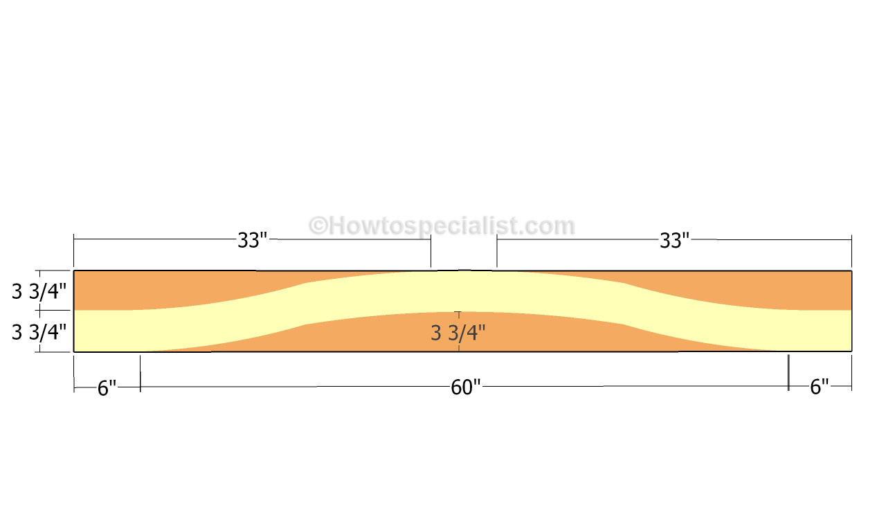 Maintenant que les racks sont solidement fixés les uns aux autres au bas du rack avec le cadre du siège et l'arrière arrière, ils doivent être connectés en haut. Pour la fabrication de poutres longitudinales courbes, vous aurez besoin de planches de 5 × 20 cm. Avec un crayon, marquez la ligne de coupe, comme indiqué sur la figure, et utilisez une scie sauteuse pour couper les pièces. Poncez le bord coupé avec du papier de verre de taille moyenne et fixez les poutres dans les évidements des montants.