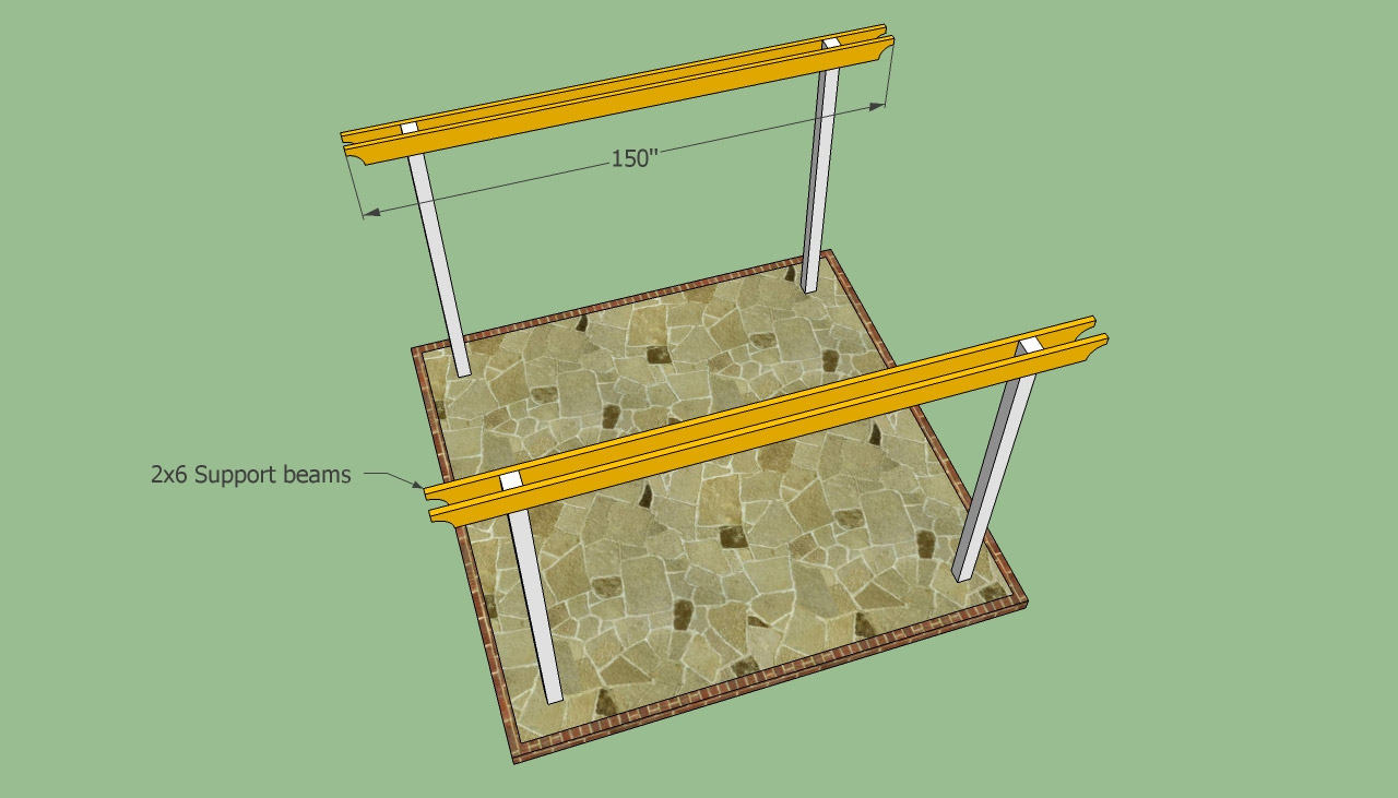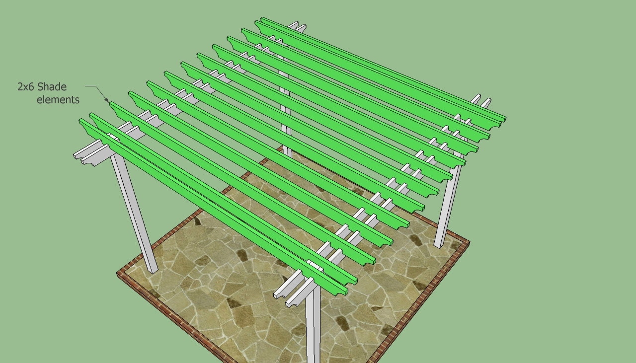 Les poutres transversales à leur place, et jusqu'à la fin du travail, il reste très peu - installez des barres transversales perpendiculaires de 5 × 10 cm. Ces poutres transversales ont un double objectif: d'une part, elles donnent à votre pergola un aspect spectaculaire, d'autre part - elles maintiennent les poutres transversales à la même distance les unes des autres ami et augmenter la rigidité.