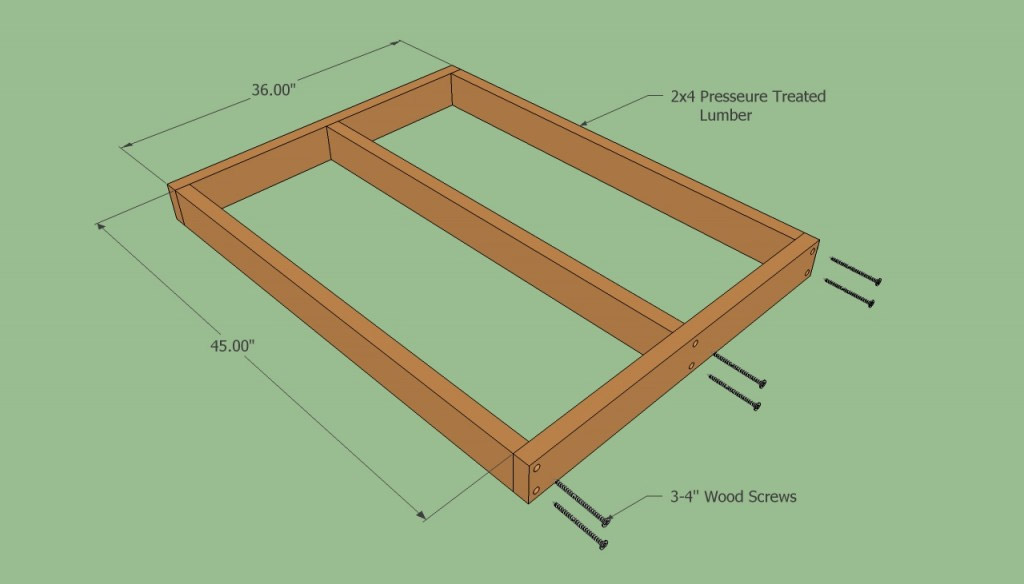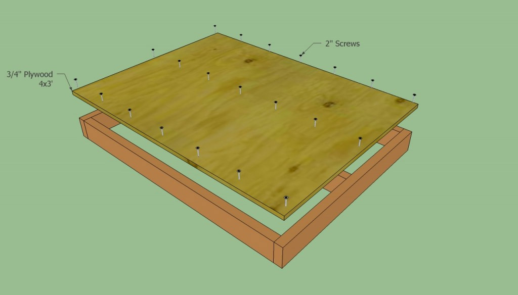 Ensuite, vous devez couper un morceau rectangulaire de contreplaqué de 18 mm de taille 90x120 cm - le sol du futur stand. Fixez-le au cadre avec des clous de 5 cm ou des vis autotaraudeuses tous les 25 cm.