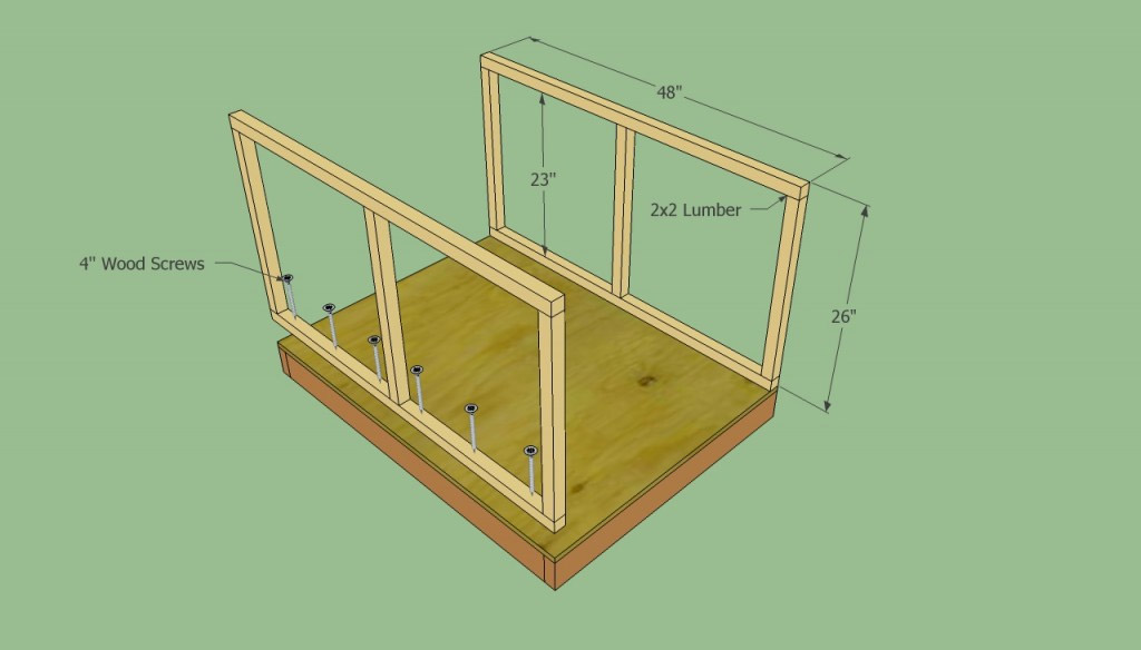 À l'aide de barres de 5 × 5 cm, construisez un cadre des parois latérales. Si vous voulez une structure rigide, installez un pilier central de chaque côté. Après avoir assemblé les cadres des parois latérales, vous devez les fixer à la base avec quelques vis de 10 cm. Avant le montage, assurez-vous que les murs sont verticaux, pour cela, vous aurez besoin d'un niveau d'alcool.