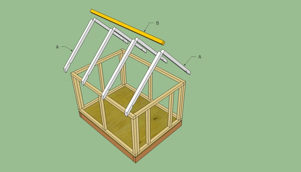 Sciez les barres de la taille requise pour les chevrons et la crête. Fixer les chevrons sur le cadre du stand à 10 cm avec des vis autotaraudeuses, après avoir vérifié leur parallélisme entre eux sur chaque pente. Coupez les extrémités des chevrons à un angle de 45º.
