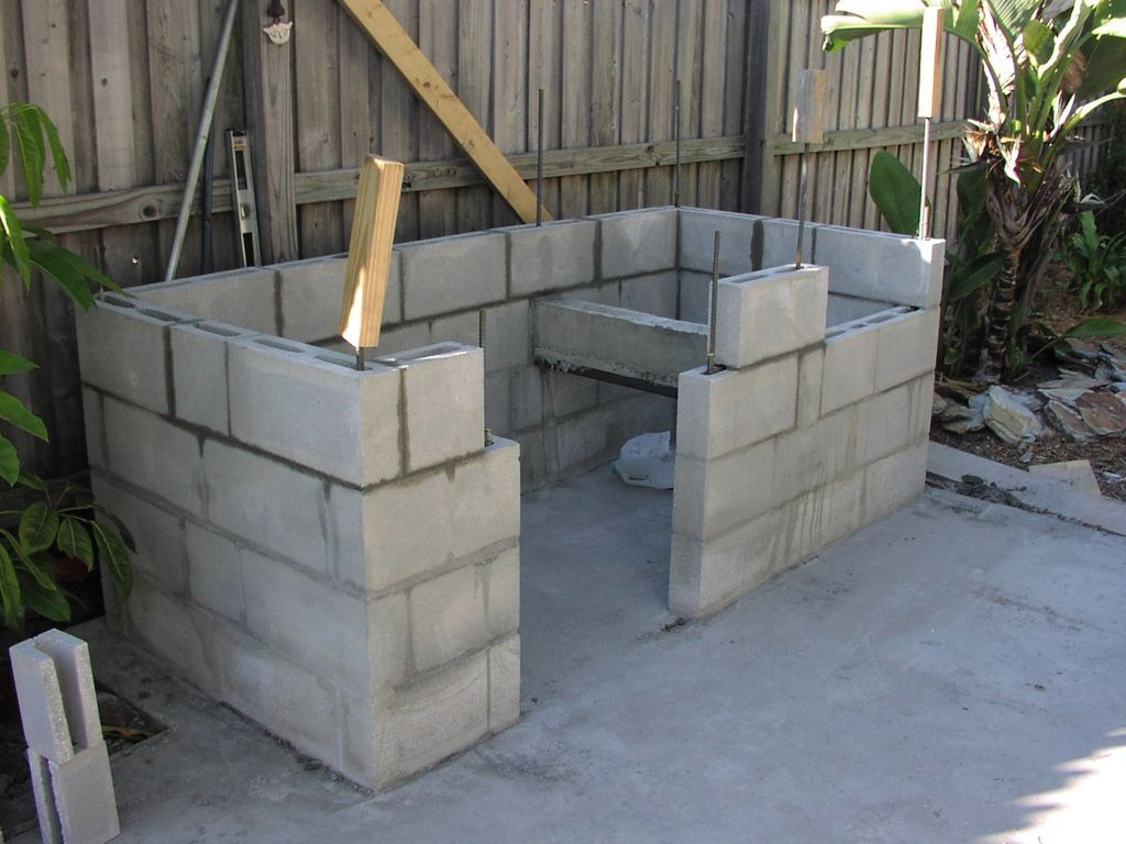 Les deux rangées de blocs empilées suivantes formaient les murs du fumoir. Comme précédemment, les cavités aux points de passage de l'armature dans chaque deuxième rangée étaient remplies de mortier de maçonnerie. Lorsque les briques réfractaires sont posées, vous devrez faire une autre cloison sous la forme d'un bloc horizontal solide.