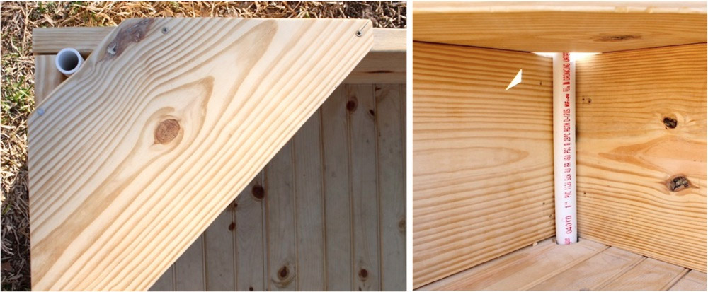 Une touche finale ... Fixez dans les coins de courts morceaux de tuyau en PVC, dans lesquels vous pourrez ensuite insérer un parasol pour vous protéger du soleil brûlant. C'était l'idée de ma femme, et je pense qu'elle est géniale. Nous avons percé un trou au fond du bac à sable pour placer le tuyau. Elle se tenait serrée dans le coin entre le banc et le côté du bac à sable. Si votre parasol est plus grand que le nôtre, vous aurez besoin d'un tuyau de plus grand diamètre.