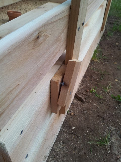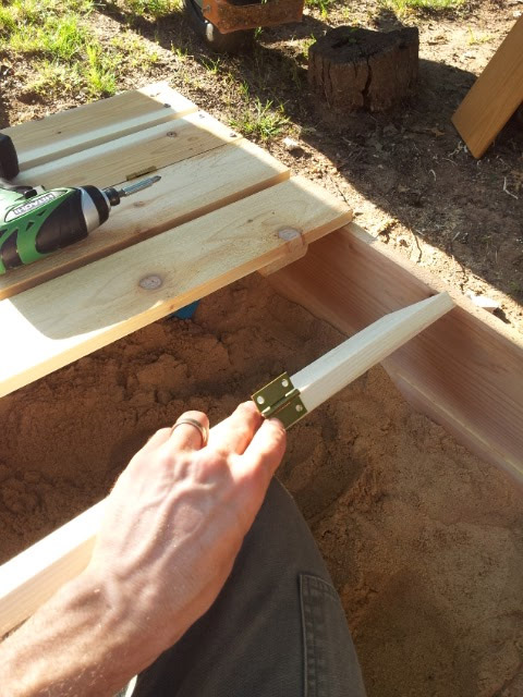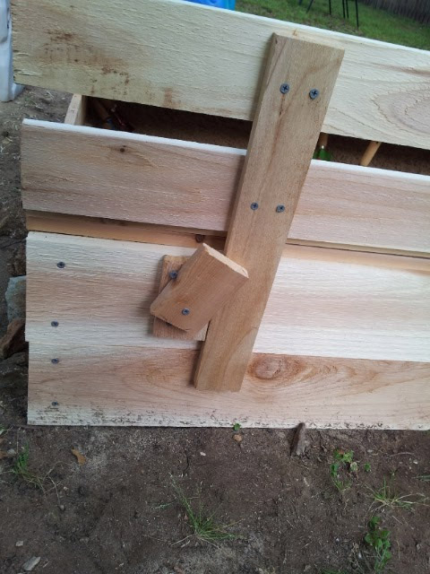 Après avoir fini de travailler et que mon enfant a commencé à jouer dans le nouveau bac à sable, j'ai réalisé qu'elle avait un défaut de conception. Un enfant qui se lève du sable pour s'asseoir sur un banc saisira inévitablement le haut de son dos pour s'aider lui-même. Cela conduit à une augmentation de la charge sur les vis de fixation des charnières du dossier au siège. Je pense que même si j'utilisais des vis plus longues pour fixer les boucles et que je réussissais à les visser sans violer la surface de la planche (et ce n'est pas une tâche facile), les boucles se briseraient toujours avec le temps. J'ai trouvé une solution à ce problème - vous devez faire de petits verrous rotatifs en bois qui maintiendront rigidement le dos en position verticale.