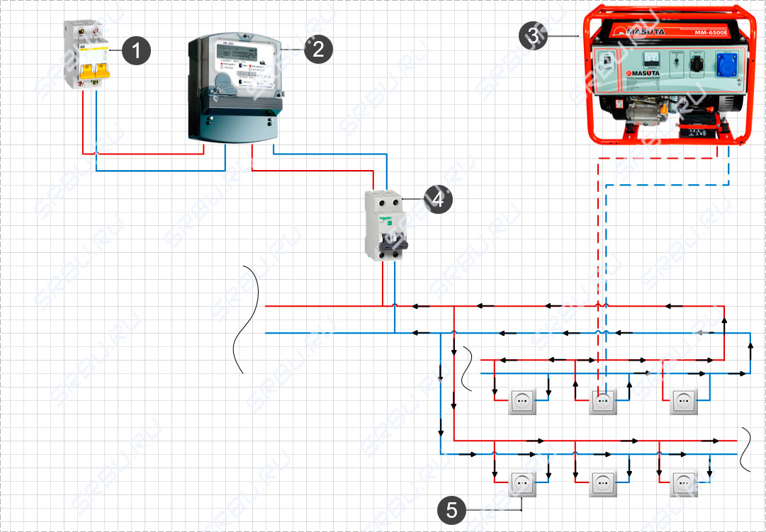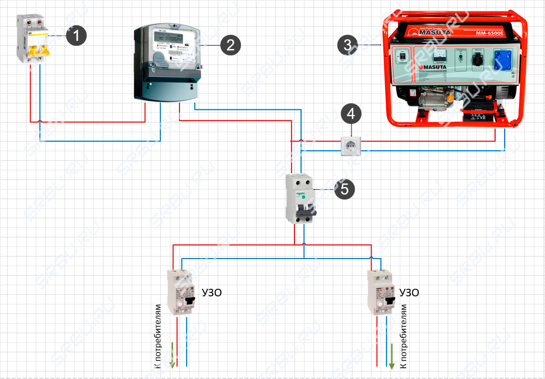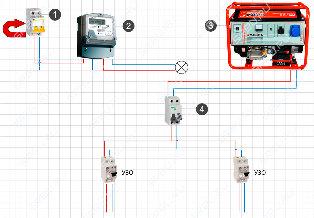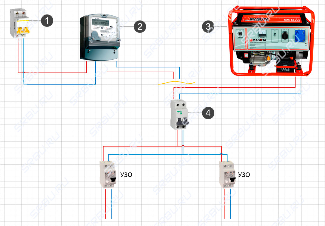 L'essentiel ici n'est pas de confondre la machine à laquelle se connecter. Si vous avez soudainement accès à la machine d'entrée en face du compteur et que vous y connectez le générateur, alors en général le circuit ne changera pas ... Il comprendra simplement un appareil de mesure de l'électricité qui ne se soucie pas s'il est considéré comme le courant de la ligne principale ou généré par le générateur.