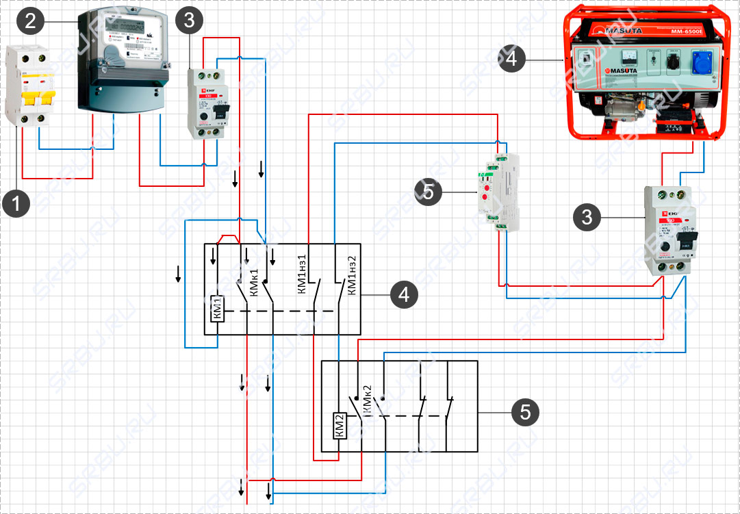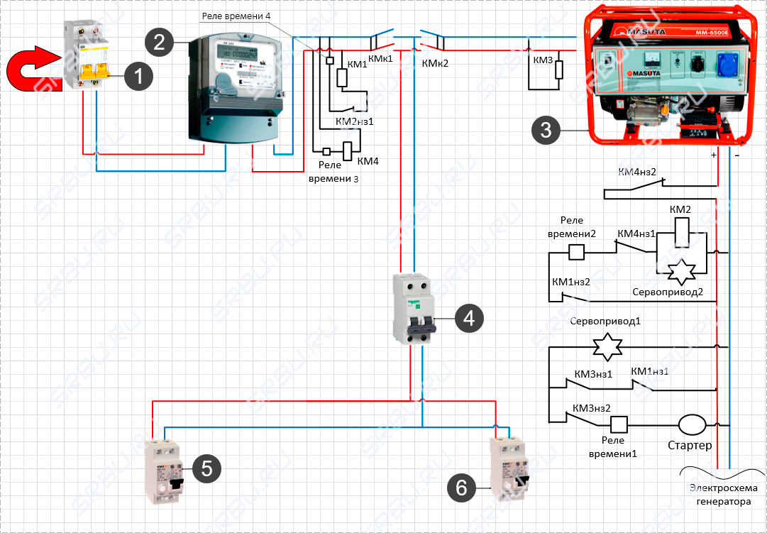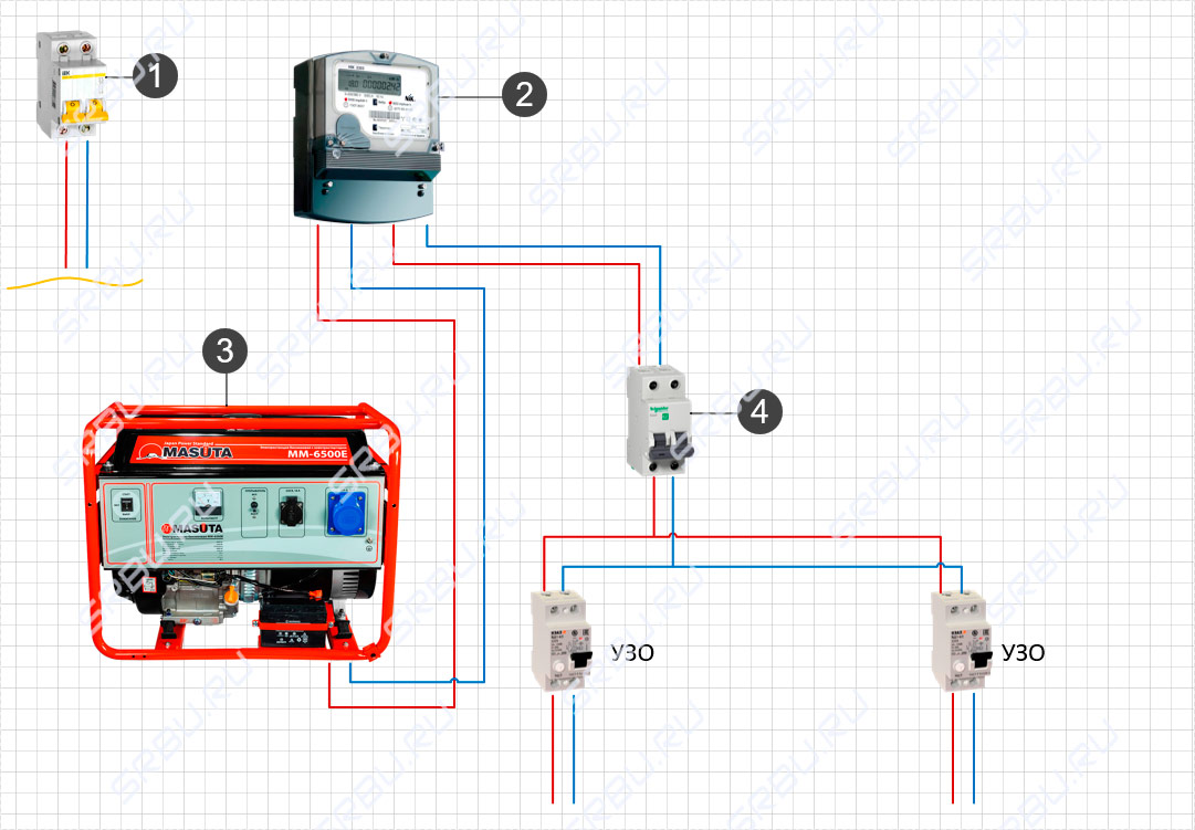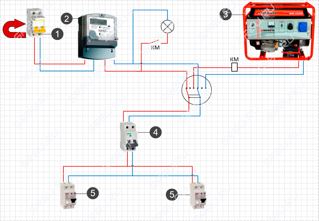 L'essentiel ici n'est pas de confondre la machine à laquelle se connecter. Si vous avez soudainement accès à la machine d'entrée en face du compteur et que vous y connectez le générateur, alors en général le circuit ne changera pas ... Il comprendra simplement un appareil de mesure de l'électricité qui ne se soucie pas s'il est considéré comme le courant de la ligne principale ou généré par le générateur.