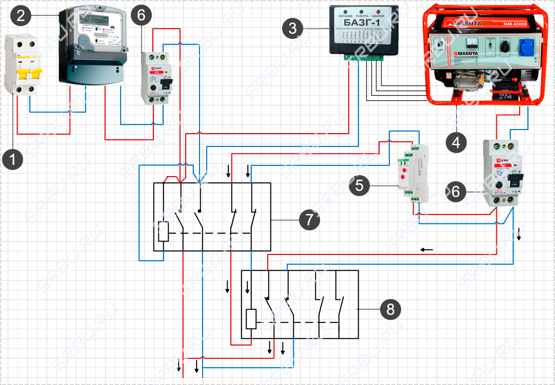 1. Machine d'introduction. 2. Compteur d'électricité. 3. Blocage pour démarrage automatique du générateur. 4. Le générateur. 5. Relais temporisé. 6. RCD. 7. Contacteur de l'entrée principale. 8. Entrée de sauvegarde du contacteur.