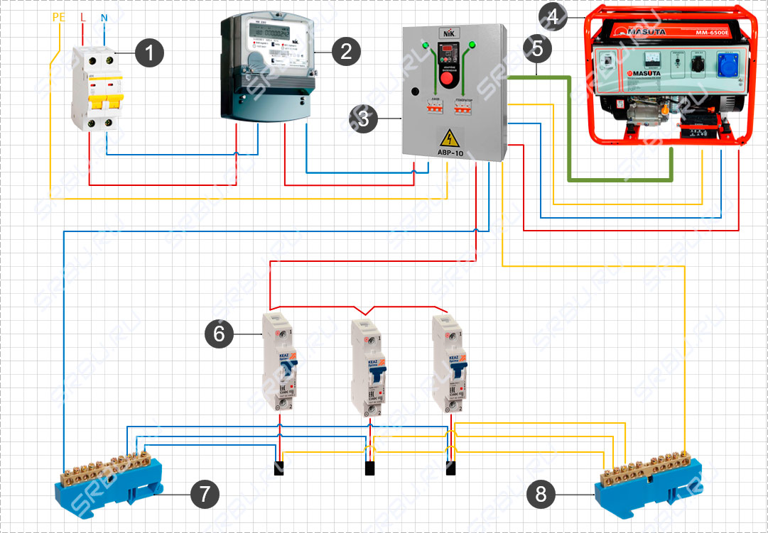 1. Machine d'introduction. 2. Compteur d'électricité. 3. ABP. 4. Le générateur. 5. Câble de commande. 6. Consommateurs d'automates. 7. Le pneu zéro. 8. Bus de mise à la terre.