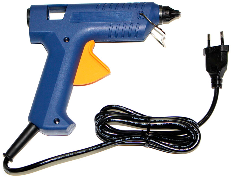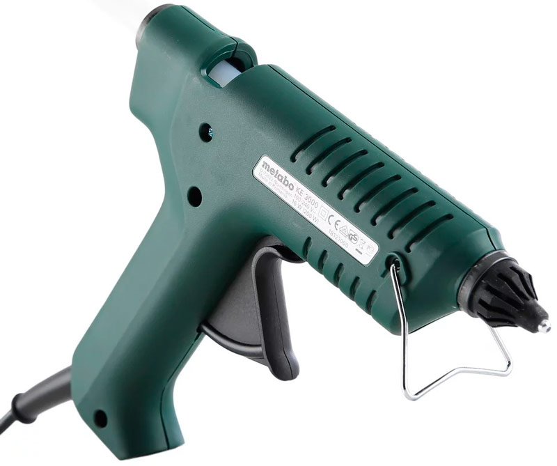 Le pistolet a une conception sûre et pratique avec une large gâchette mécanique, un arrondi à l'extrémité de la poignée et une jambe en métal pour fixer un outil chauffé sur une surface plane. Une puissance de 200 watts assure une fusion rapide de l'adhésif
