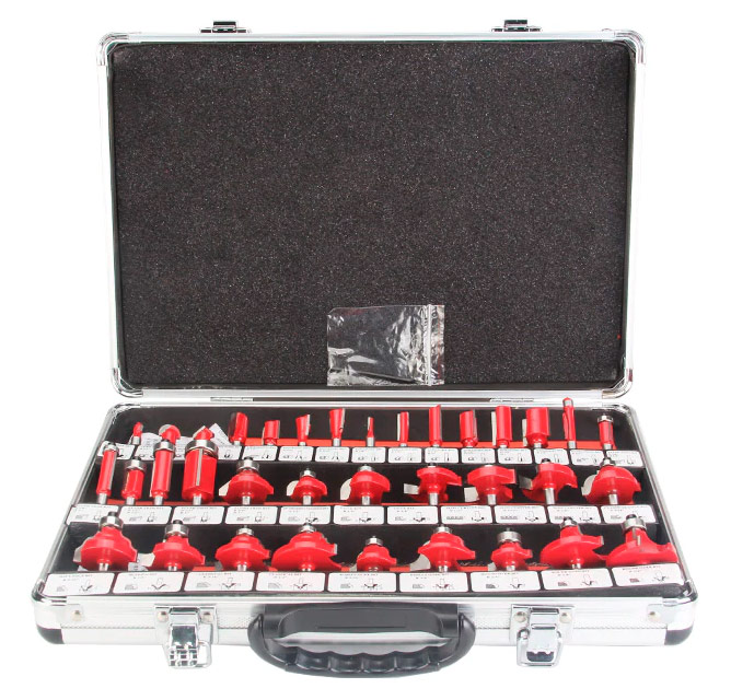 Un ensemble de 35 unités emballées dans un étui avec une bordure en métal, des serrures et une poignée. Toutes les fraises ont une tige de 8 mm et sont en acier au carbure de tungstène.