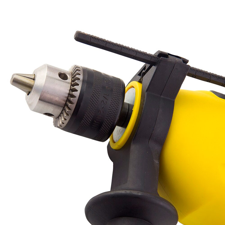 Perceuse avec contrôle de profondeur, mandrin métallique et moteur 750 Watt. Les modes de commutation sont effectués par un engrenage planétaire sur le boîtier.