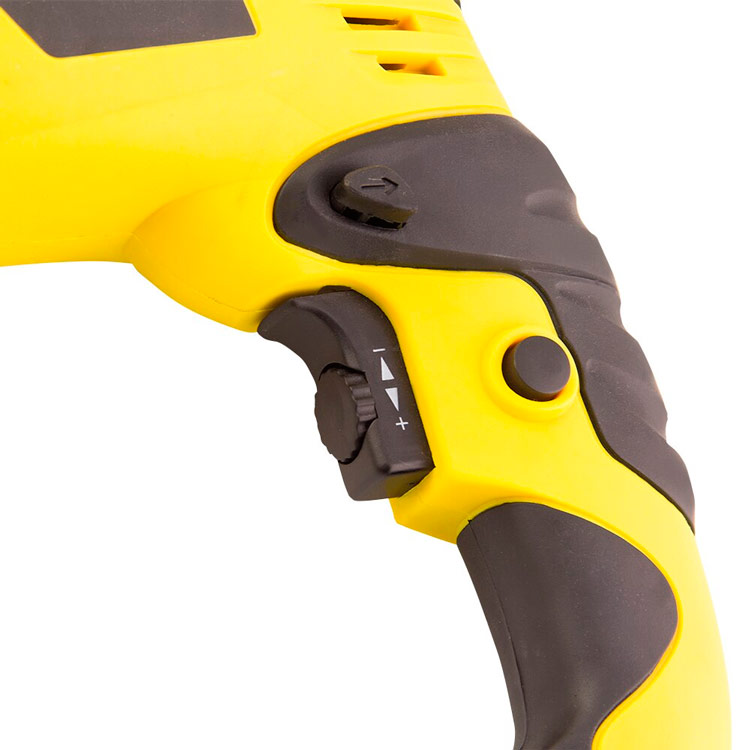 Un marteau perforateur dynamique au design agressif. Sur le boîtier jaune, les coussinets en caoutchouc noir contrastent favorablement. Outil électrique 800 watts. Ils peuvent être actionnés d'une seule main, mais l'installation d'une deuxième poignée rotative est également prévue.