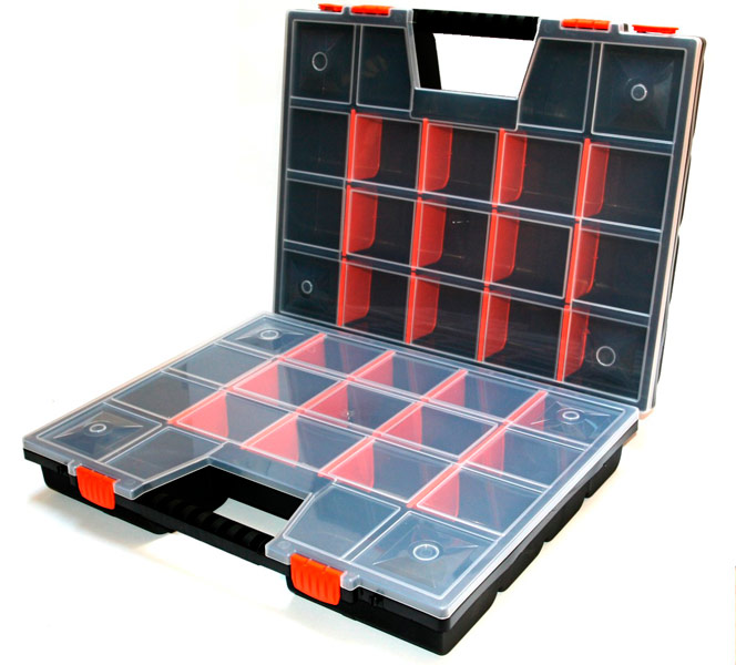 Dans la plupart des cas, il ressemble à un étui, bien qu'il puisse parfois ressembler à une table de chevet avec des sections coulissantes. Il se distingue par la présence de nombreux compartiments internes destinés à stocker des pièces de petite taille (fixations, buses interchangeables pour une perceuse, etc.). Les séparations entre les compartiments sont généralement rendues amovibles - cela vous permet de modifier la configuration des sections, en les adaptant à un outil particulier ou à de petits accessoires (têtes de douille, embouts, boulons, vis, etc.). L'organisateur peut être utile non seulement au maître, mais aussi à ceux qui s'occupent de petits objets (en particulier les pêcheurs).