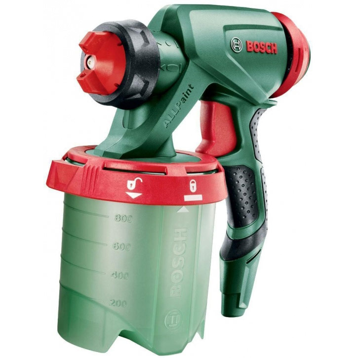 Tous ces outils de Bosch sont fabriqués dans un boîtier vert, ce qui signifie que l'appareil est destiné à un usage domestique. Dans le même temps, la réserve de marche est suffisante pour utiliser un tel pistolet pulvérisateur dans une production à petite échelle.