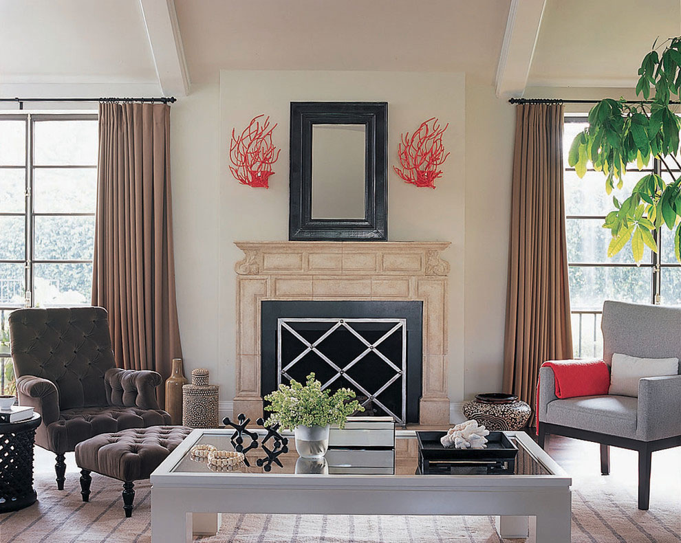Néanmoins, en beige, il y a quelque chose comme ça ... surtout si vous le combinez avec des nuances lumineuses de rouge! Cela met non seulement en évidence la couleur vibrante sur un fond beige. Le rouge peut ajouter plus de drame que les couleurs froides telles que le blanc pur. Ci-dessous, nous pouvons voir des branches de corail des deux côtés du miroir dans un cadre noir. Il est difficile de ne pas faire attention à la couleur rouge-orange, surtout parce qu'elle fait écho à la couleur vibrante du couvre-lit posé sur l'accoudoir ...