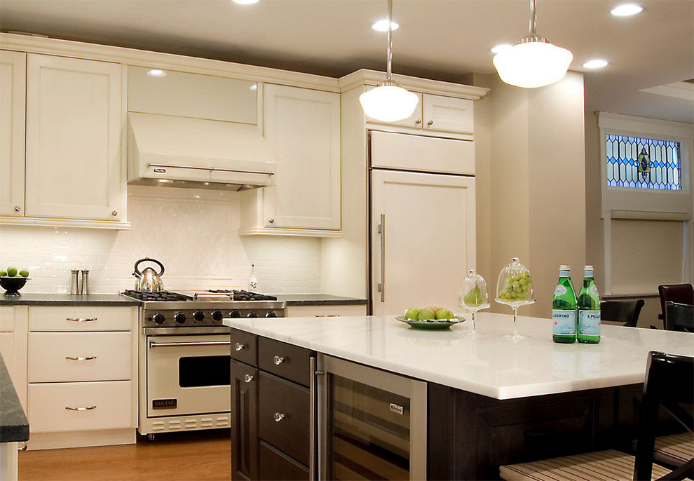 Cela est peut-être dû au fait que ces couleurs rappellent des éléments naturels tels que le sable, l'herbe et le ciel. Et c'est peut-être parce que les couleurs vertes et bleues se détachent sur un fond sombre mais saturé. Mais pour une raison quelconque, les couleurs beige, bleu et vert sont souvent combinées dans diverses configurations pour améliorer le style de l'intérieur. Nous commencerons par deux teintes: vert et beige. Ci-dessous, une photographie d'une cuisine beige avec un accent vert sur la nourriture et les boissons.