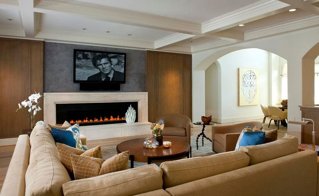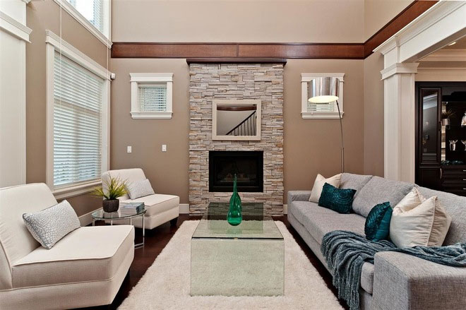 Lorsque le beige, le bleu et le vert se combinent, le résultat est étonnant. Cela peut être vu sur la photo ci-dessous du salon. Le feuillage jaune-vert est inférieur aux vases vert émeraude, dont l'attention va aux oreillers bleu verdâtre de cette pièce, créés par Positive Space Staging + Design Inc.