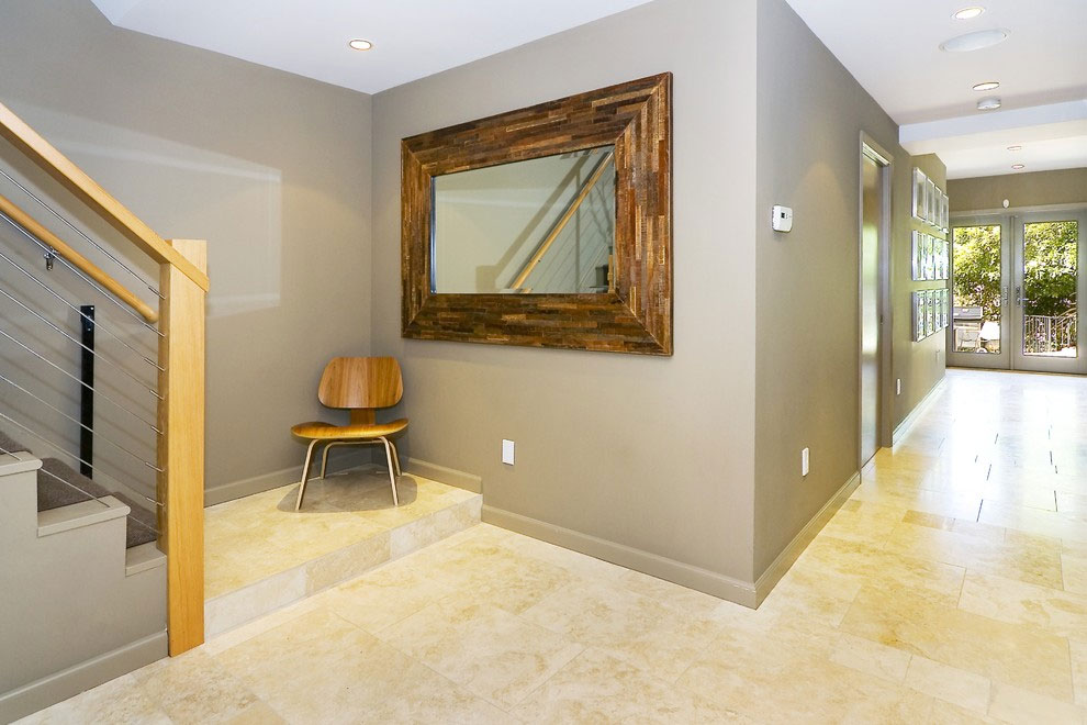 Voici des nuances intéressantes de beige à l'intérieur d'un escalier moderne. Nous notons une abondance de tons chauds, y compris une teinte vanille de carreaux de sol, un grand miroir dans un cadre de couleurs marron saturé et une chaise en bois doré.