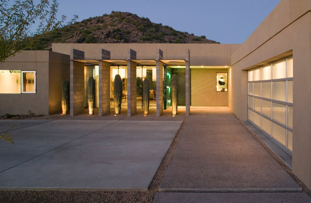 Le beige est une couleur populaire pour la décoration extérieure moderne, comme on peut le voir clairement sur la photo suivante. Veuillez noter que la maison elle-même, le gravier et les sentiers pavés - ont tous des nuances de beige. Appréciez également comment les lumières dorées à l'extérieur de la maison aident à éclairer tout l'espace, projetant des ombres chaudes des éléments beiges.