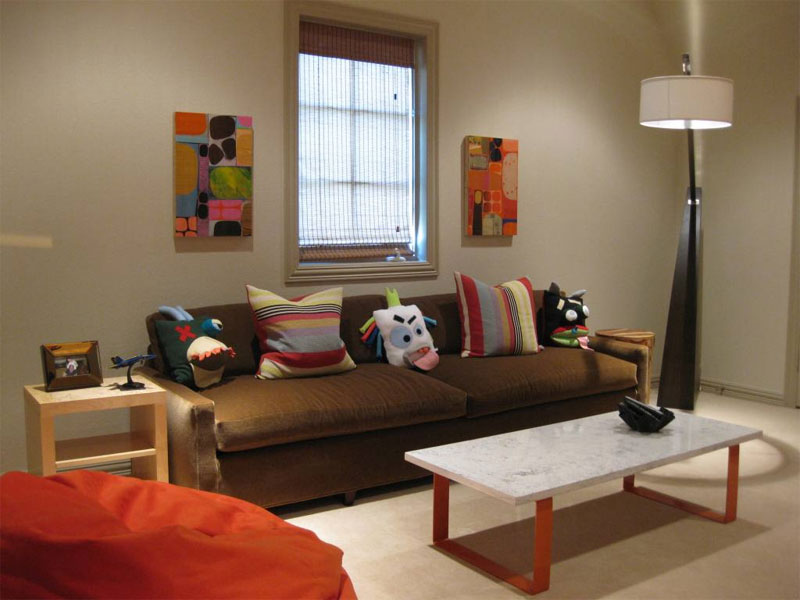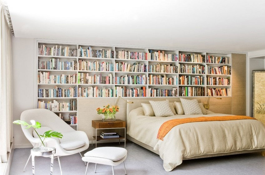 Dans la chambre moderne illustrée sur la photo suivante, la palette beige sert de magnifique toile de fond pour une collection de livres qui semblent plus vibrants sur le fond de la couleur du mur. Dans le même temps, la couleur du mur n'interfère pas avec le jeu arc-en-ciel des couleurs des couvertures de livres. Faites également attention à la façon dont l'orange se démarque clairement.