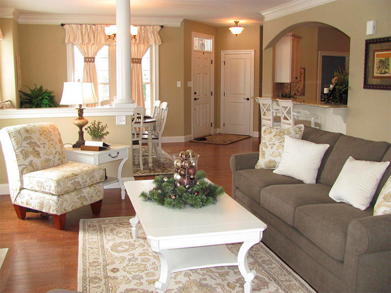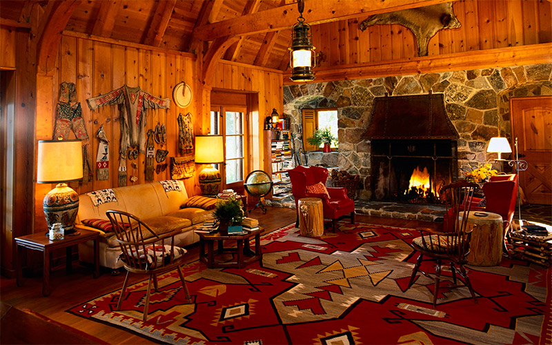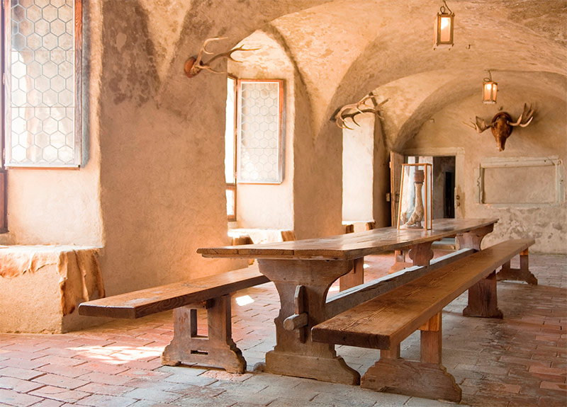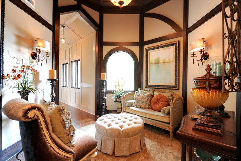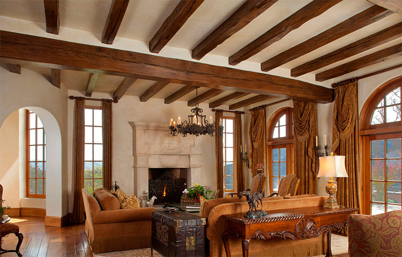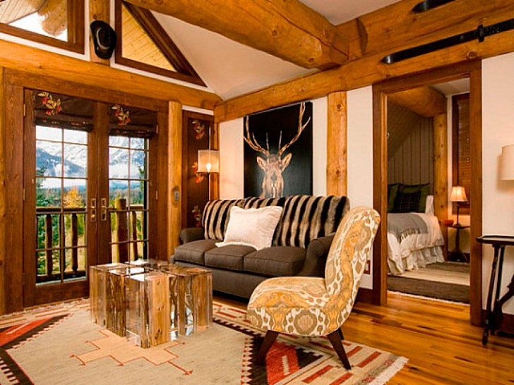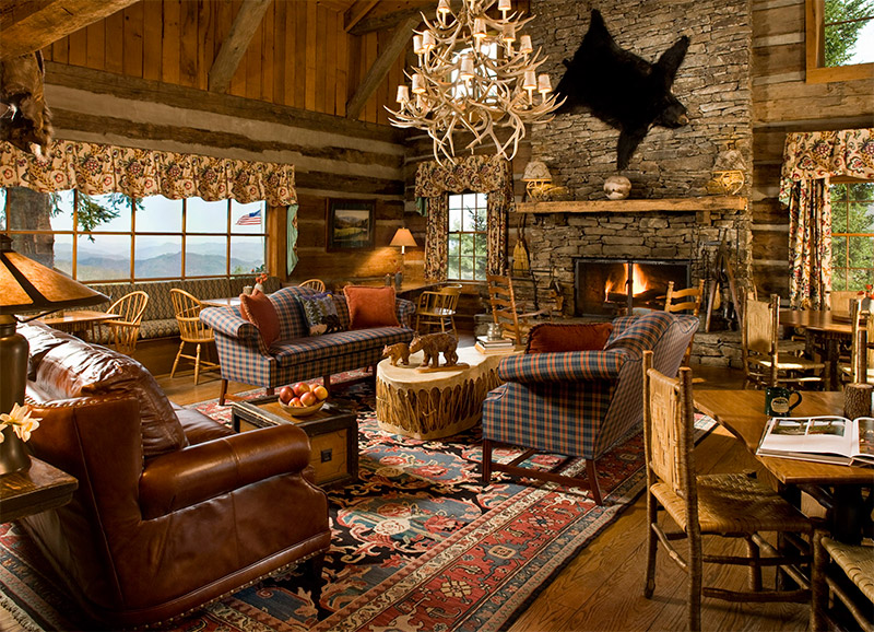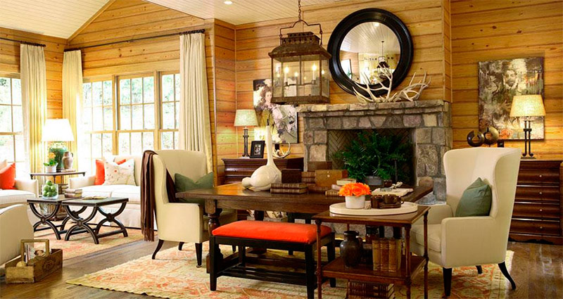 Salle de séjour il faut un lustre en fer forgé ressemblant à un candélabre avec des chandeliers, des peintures sur les murs, de belles bougies massives en chandeliers, des lampadaires, des cercueils avec de petites boules, des figures décoratives. A volonté, cette salle est décorée comme une salle de gloire de chasse - oiseaux et animaux en peluche, peaux de fourrure, armes.