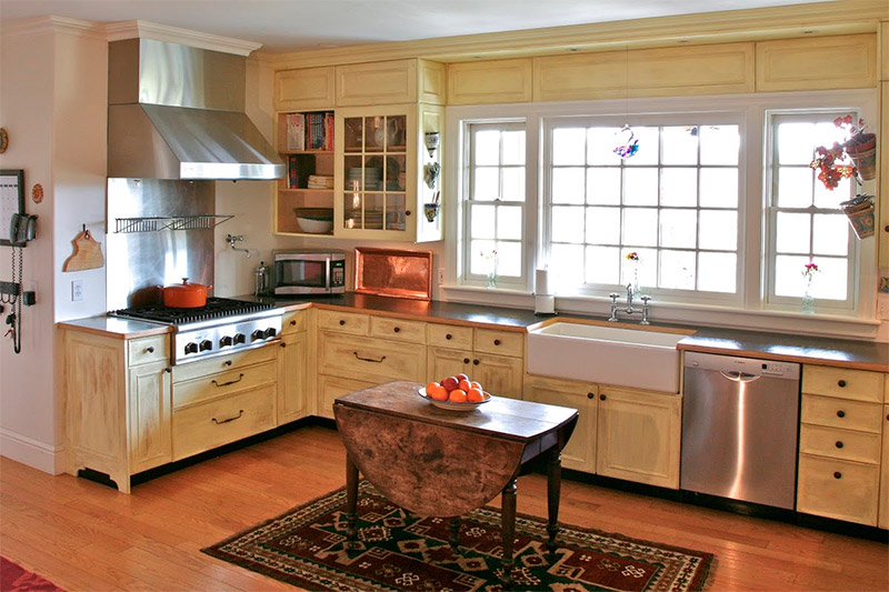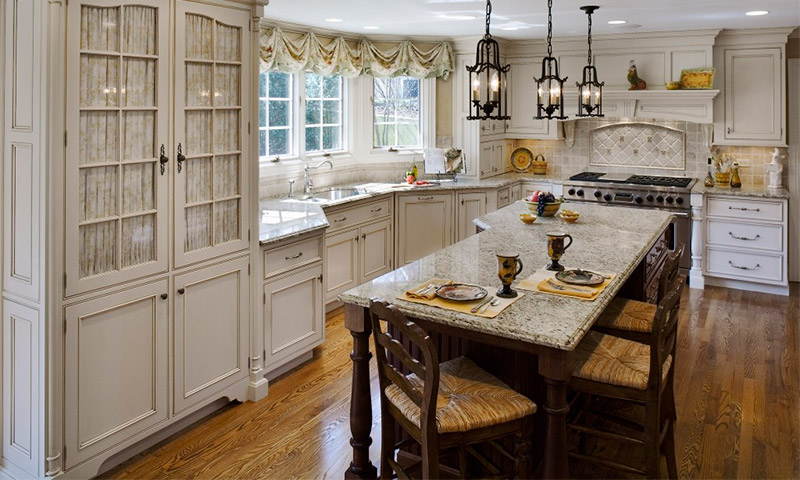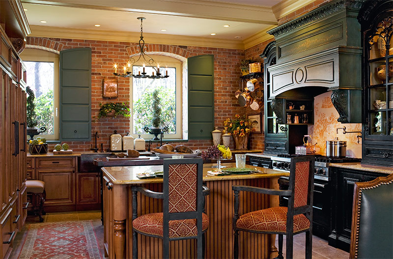 De plus, les murs et le plafond peuvent être blanchis ou collés avec du papier peint en papier ordinaire ou dans un petit motif floral. La cuisine est très élégante. En règle générale, une pièce spacieuse est décorée de panneaux en bois, les plafonds blanchis sont complétés par des retards clairement définis en bois foncé, les sols peuvent être en pierre (parfois ils utilisent des carreaux en pierre naturelle).