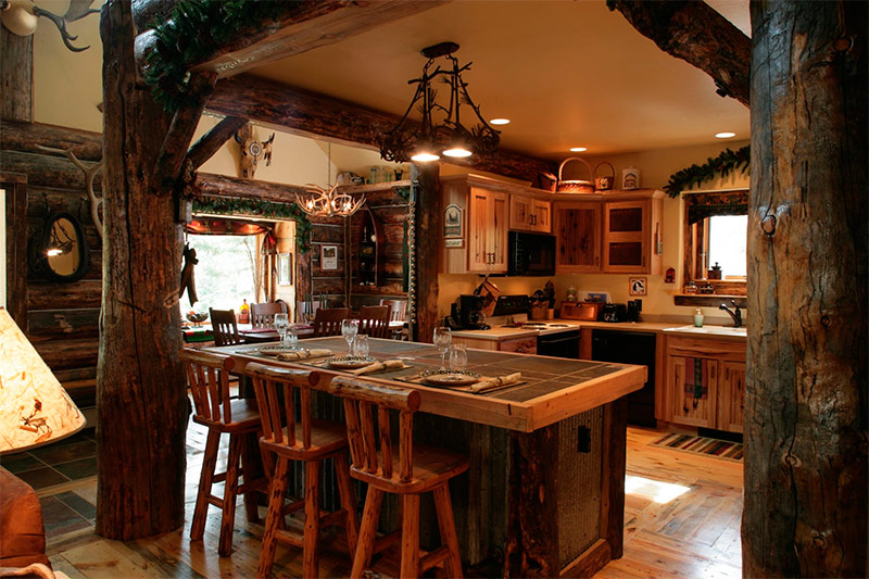Chaque pièce de la maison est meublée d'une manière spéciale, ramassant l'ensemble nécessaire et excluant tout ce qui n'est pas nécessaire. Un buffet, des étagères suspendues, une table de travail et de salle à manger solide et des chaises sont placés dans la cuisine. Ces derniers, si possible, peuvent être remplacés par des bancs. Ils soulignent davantage l'esprit rustique. Le salon a des meubles rembourrés avec un revêtement en cuir ou en tissu épais. Elle est complétée par une table basse, des chaises, des bibliothèques massives. Dans la chambre, il suffit d'installer un lit, une armoire et des chaises en osier si besoin. Si la maison a une terrasse, elle a des chaises en osier et une table.