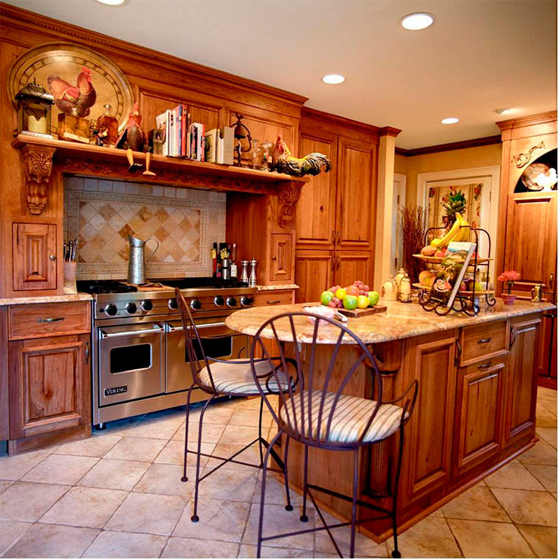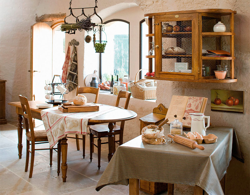 La cuisine nécessite beaucoup de travail de décorateur. Il peut être décoré d'assiettes en céramique, de casseroles polies et d'autres ustensiles en métal. Tous les plats sont placés dans un endroit bien en vue: dans des étagères ouvertes, suspendues au-dessus du poêle ou du buffet. Sur la table, mettez un panier de vignes pour du pain ou des fruits. Les épices, les céréales, le thé et le café sont distribués dans de nombreux pots et boîtes, qui sont décorés de leurs propres mains et mis en évidence.