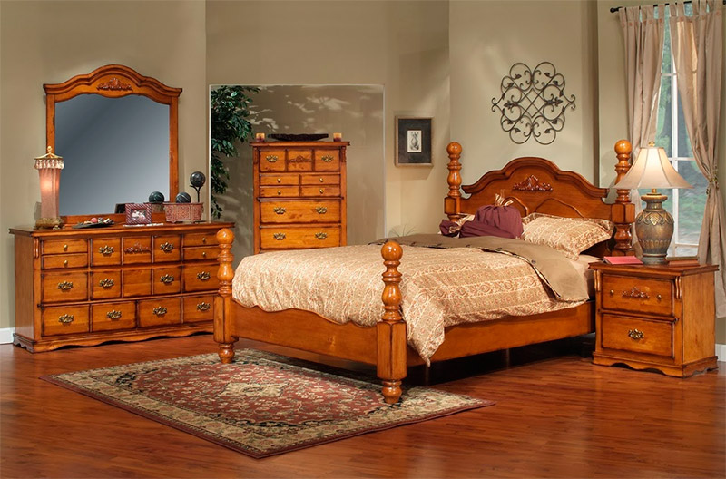 7. Meubles en ligne droite. Les meubles en bois sont choisis parmi le bois naturel avec une texture clairement visible. Pour un coin doux dans le salon, une belle tapisserie d'ameublement avec un petit motif est acceptable. Pour la chambre, vous pouvez choisir non seulement un lit en bois, mais aussi un lit forgé.