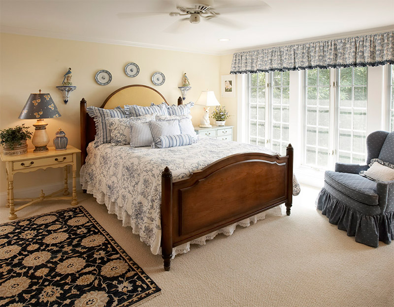 La beauté et la naïveté rustique des lieux sont fortement soulignées par le design textile. Ça devrait être beaucoup dans les chambres. Pour chaque chambre, des nappes, des tapis, des serviettes, des couvre-lits et, bien sûr, des rideaux sont sélectionnés. Dans la cuisine, accrochez des rideaux, des cafés ou des rideaux à volants au milieu de la fenêtre. Le motif des rideaux et des nappes, le rembourrage des chaises et les serviettes en dentelle doivent être les mêmes. En règle générale, il s'agit d'une combinaison d'une gamme de deux couleurs (blanc avec vert, bordeaux, bleu, marron), complétée par un motif brodé à la main, cousu avec de la dentelle. Dans la chambre, des rideaux sont accrochés au sol, mais il y a des micros pour eux. Le lit est recouvert d'un plaid ou d'un couvre-lit dans une seule couleur avec des rideaux. S'il y a un fauteuil ou un canapé dans la pièce, leur rembourrage doit être à la même échelle que les autres textiles. Le salon est décoré d'un grand tapis moelleux, de rideaux simples qui se marient parfaitement avec des oreillers moelleux et des meubles rembourrés.