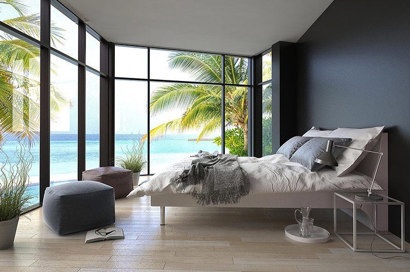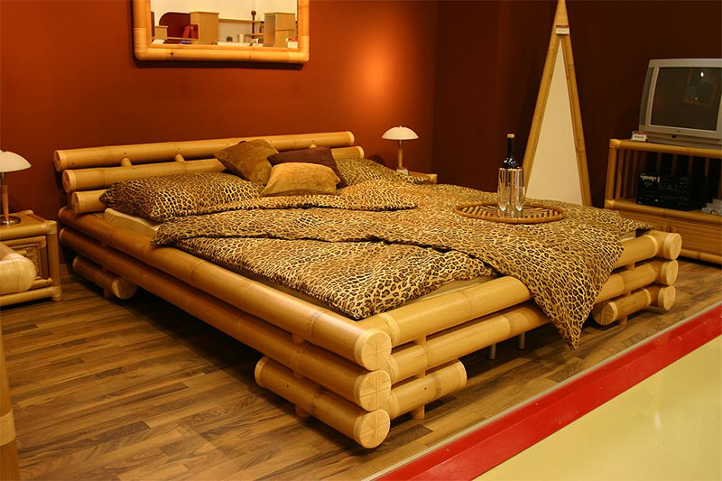 Un grand lit est ramassé dans la chambre. Il peut être forgé, mais le bois ou le bambou ont un aspect plus organique.