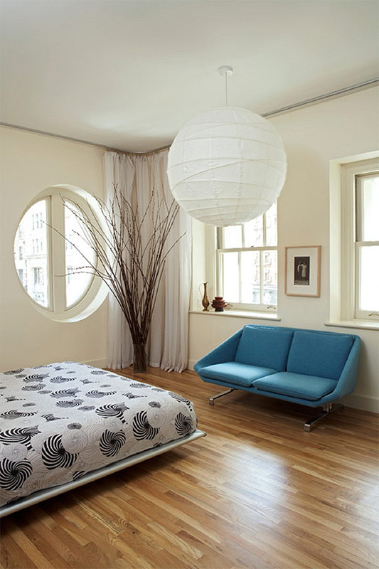 La conception textile doit être modérée et simple. Utilisez des tissus naturels - lin, coton, ainsi que des nattes. Les fenêtres ne font pas de rideau si possible. Ils laissent donc entrer plus de lumière naturelle et économisent de l'énergie électrique. S'il est nécessaire de les fermer des yeux des autres, essayez de ramasser des rideaux de conception simple - roulés, japonais ou romains. Les textiles de la chambre sont sélectionnés pour la conception du lit et des meubles rembourrés afin qu'ils s'harmonisent les uns avec les autres.
