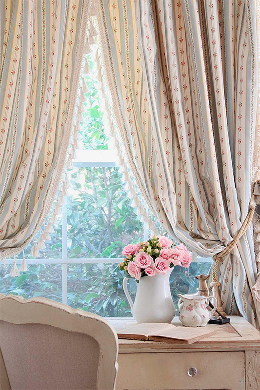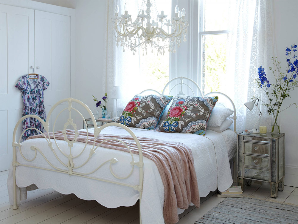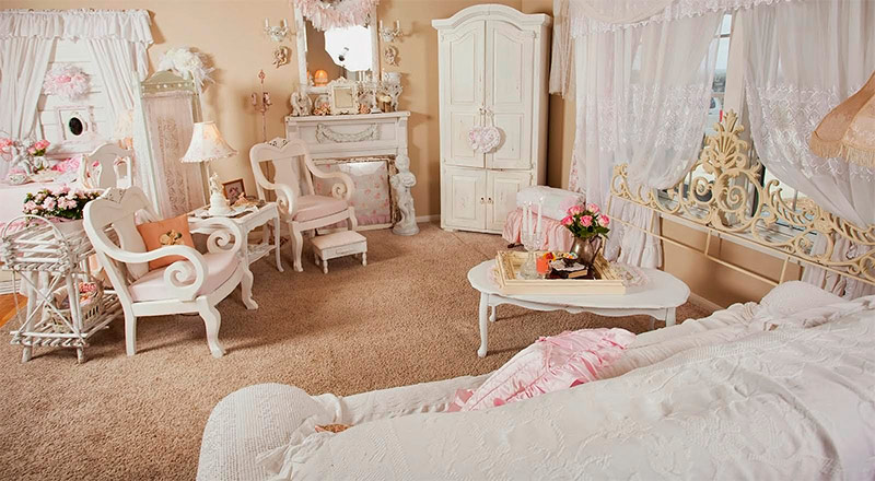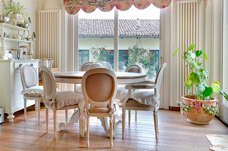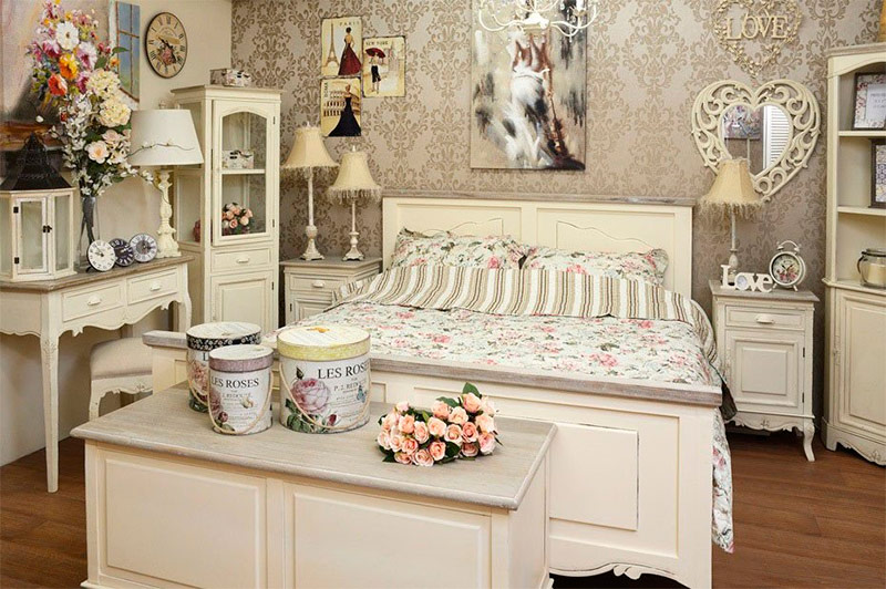 7. Une autre caractéristique du style est l'abondance de textiles. Le style, bien que créé par la modernité, ne supporte pas les formes strictes du minimalisme ou la froideur de la haute technologie. Les rideaux et les couvre-lits doivent être confortables, beaux, avec des plis en tissu léger. Le tissu pour la décoration des fenêtres est sélectionné pour les plus divers, en fonction du contexte général de la conception. Un rideau épais et dense avec des glands le long du bord, un rideau lumineux avec un motif de roses, un rideau transparent de couleur blanche conviendra.