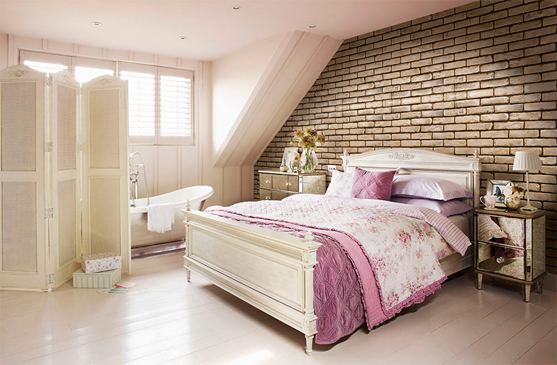 L'accent est mis sur la conception du lit. La base est généralement prise d'une combinaison de couleurs blanches et pastel. Par exemple, rose cendre. Dans cette veine, les draps, les couvre-lits, les housses de rouleaux et d'oreillers sont sélectionnés. Les tissus unis et à motifs alternent. Un lit lumineux est complété par des oreillers décoratifs denses répétant des motifs. Les rideaux peuvent être monophoniques denses, protégeant de la lumière vive ou complètement légers. Par exemple, en organza ou en mousseline.