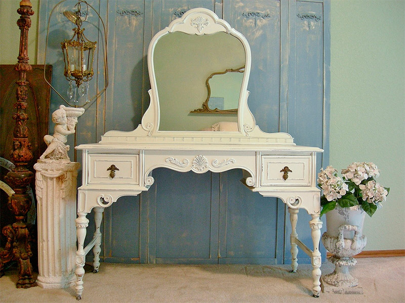 Les meubles dans le style du shabby chic n'ont pas été produits et ne l'ont pas fait massivement. Les meubles classiques, empire, vintage et antiques conviennent à ce style. Il est important qu'il soit naturel et non pas à partir de sciure de bois pressée ou de fibres synthétiques. Si nécessaire, l'apparence des armoires, tables ou chaises peut être corrigée. Pour poncer la vieille peinture, appliquez plusieurs couches d'une nouvelle, créez l'effet de fissuration aux bons endroits.