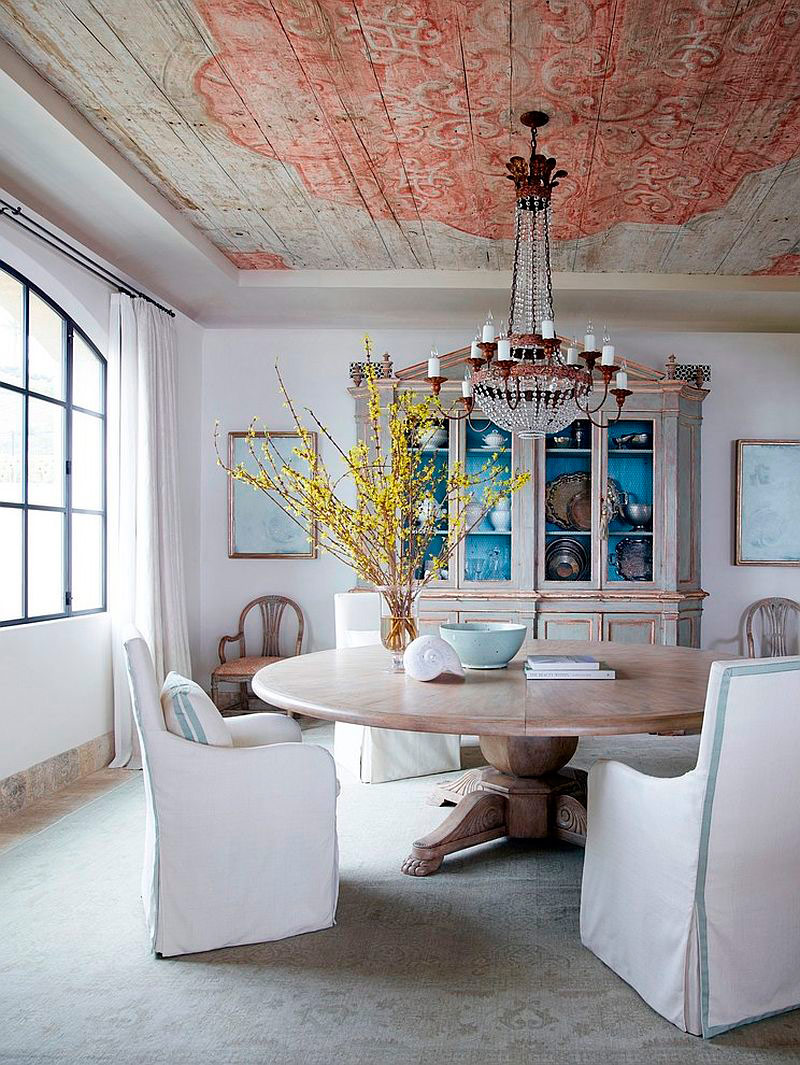 Le plafond peut être une toile de fond pour un décor antique. Si la pièce est remplie d'objets qui attirent grandement l'attention, le plafond est lisse et uniforme, le recouvrant de peinture ordinaire ou de badigeon. Si la pièce a beaucoup d'espace libre, le mobilier a l'air simple, le plafond est décoré dans un style antique. Des traces de temps peuvent y apparaître: stuc collé, peinture décolorée, peeling à la chaux.