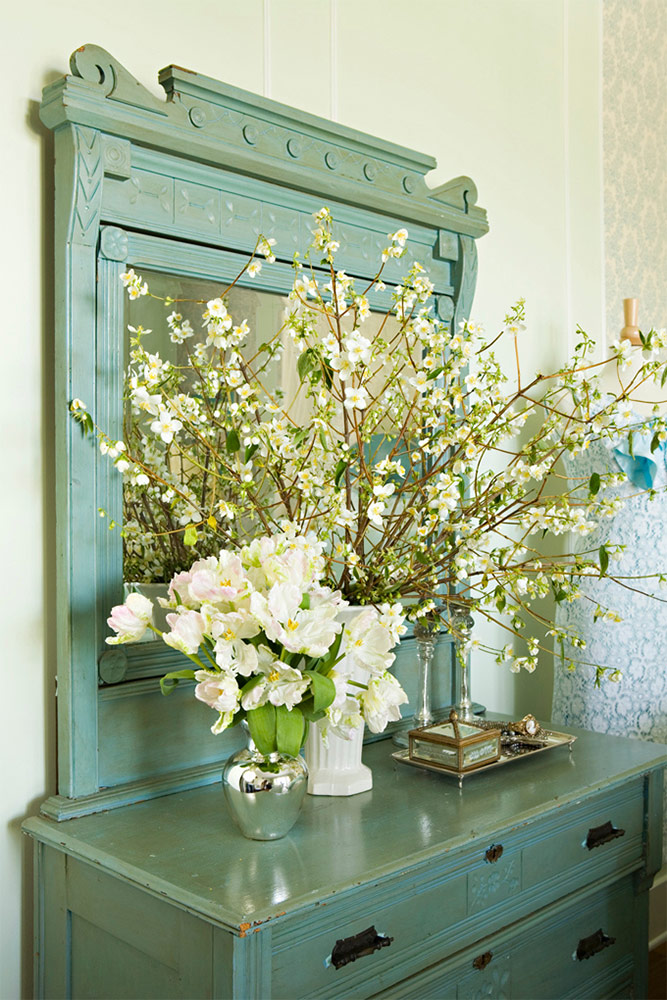 3. Complétez la pièce avec un décor exquis. Il joue un rôle important dans l'image globale de l'intérieur. Il crée l'impression finale de l'ancien luxe et de la richesse. Les appartements Shabby Chic sont élégamment décorés avec des carafes et des services anciens, des fleurs fraîches (les plus sophistiquées et parfumées), des cercueils en bois avec des roses en surface.