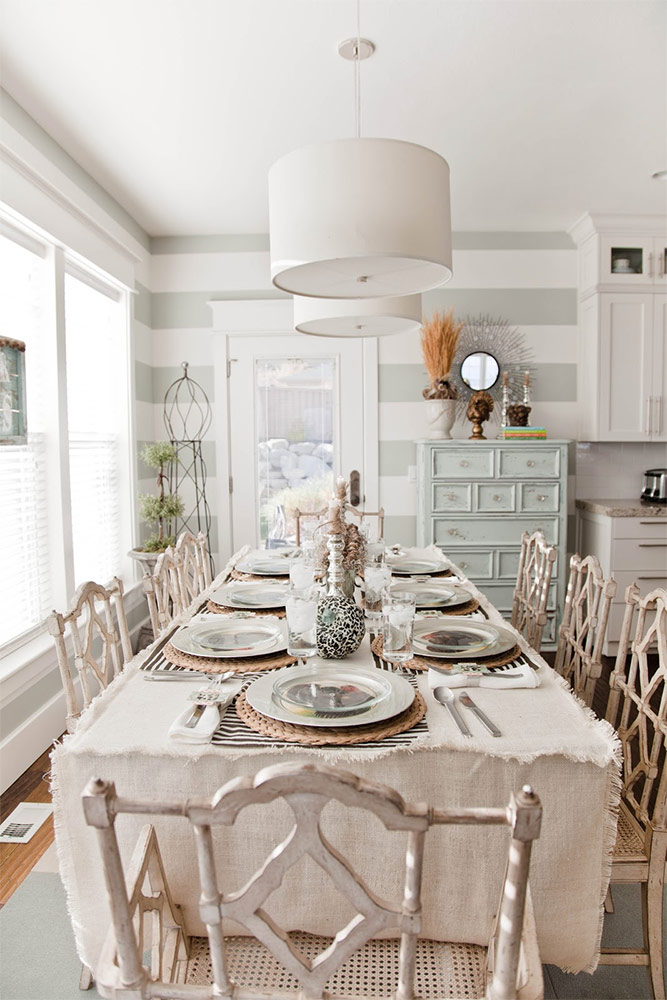 L'endroit principal dans la cuisine est la salle à manger. Il est décoré d'une nappe, de housses ou d'oreillers pour chaises. De beaux rideaux sont ramassés. La table est décorée de serviettes.