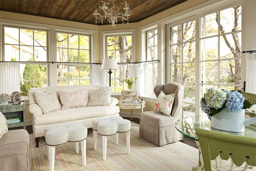 2. La palette de couleurs de l'intérieur est déterminée, encore une fois, en se concentrant sur la couleur du mobilier. Si les chaises ou la table sont blanches, les murs et le sol doivent être ombragés. Ils sont décorés en beige, crème, rose ou vert clair. Si les meubles sont plus proches du brun, les surfaces planes sont décorées en blanc.