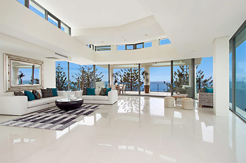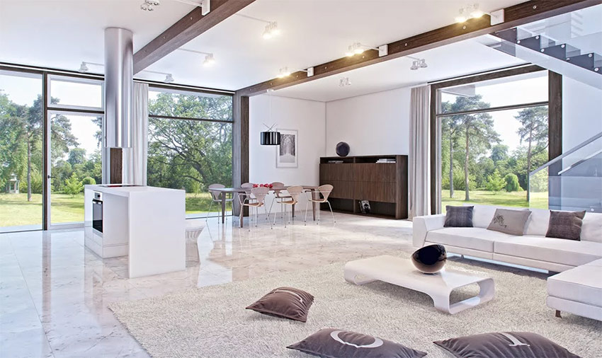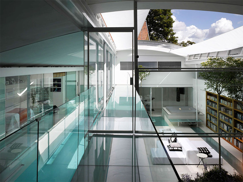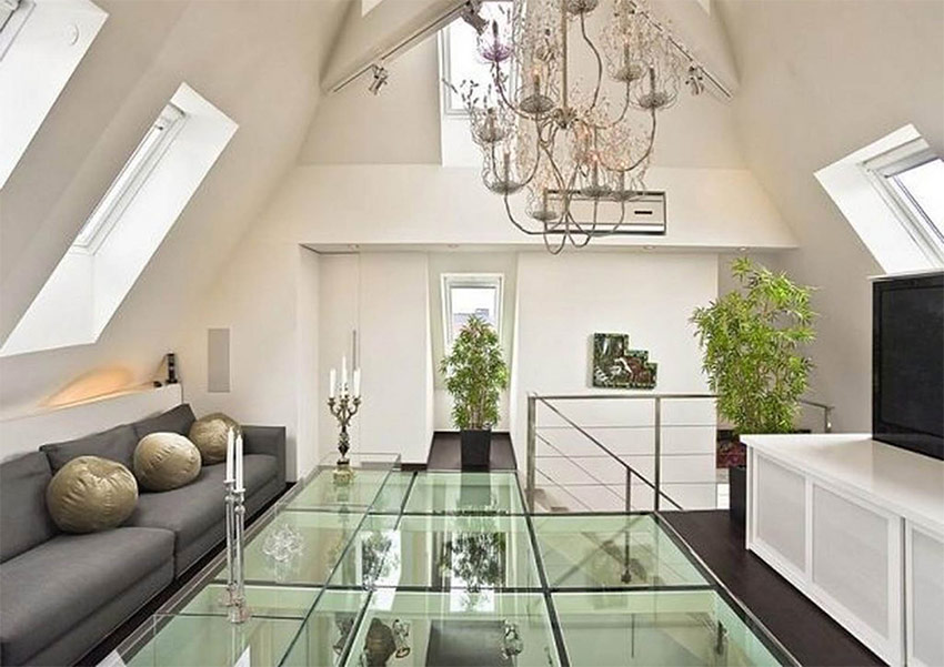 La façon la plus exotique d'utiliser du verre à l'intérieur est d'en faire un revêtement de sol. Il est préférable d'utiliser un tel plancher transparent dans un bâtiment à plusieurs étages, où à partir d'une hauteur de 4 étages, vous pouvez clairement voir ce qui se passe au premier étage. En fait, une telle idée a déjà été incarnée par des designers dans des projets audacieux de design d'intérieur d'appartements dans le style du minimalisme, de la haute technologie ou de la fusion. Une condition importante pour les sols transparents est qu'ils soient réalisés dans un espace commun, par exemple, entre le salon et le couloir ou le hall et le salon. Les clients apprécieront et se souviendront longtemps de la façon dont ils ont «plané» au-dessus du premier étage de la maison.