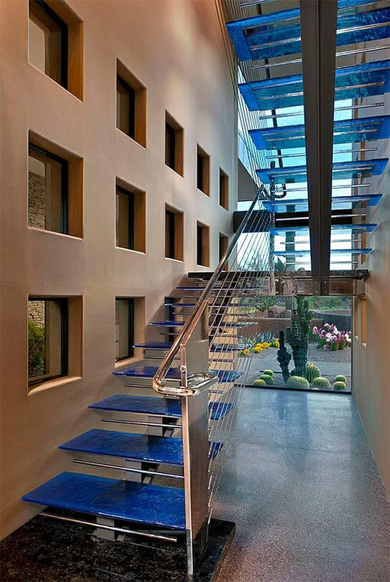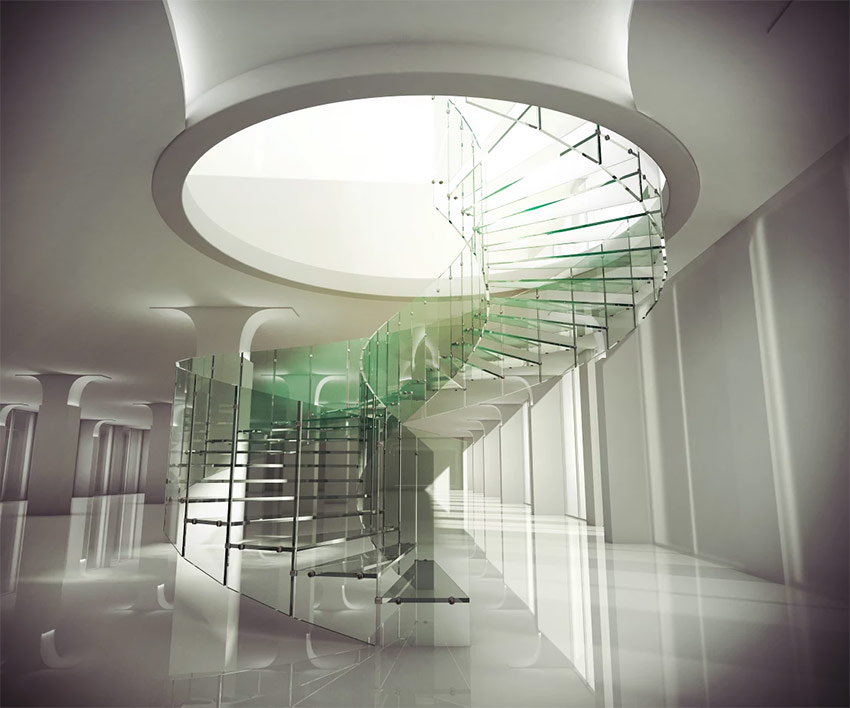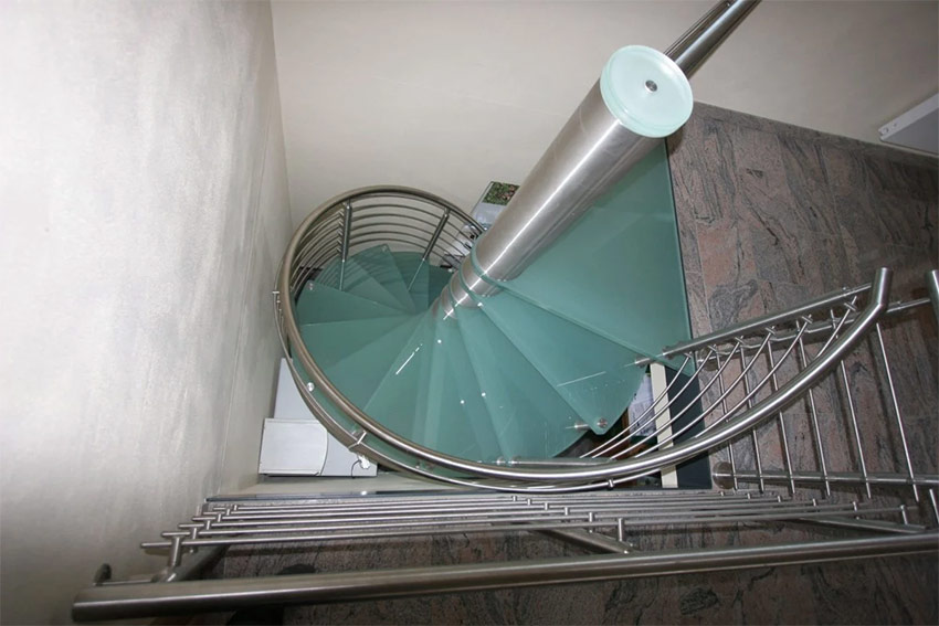 - l'escalier en colimaçon est équipé de marches transparentes colorées et de garde-corps en métal;