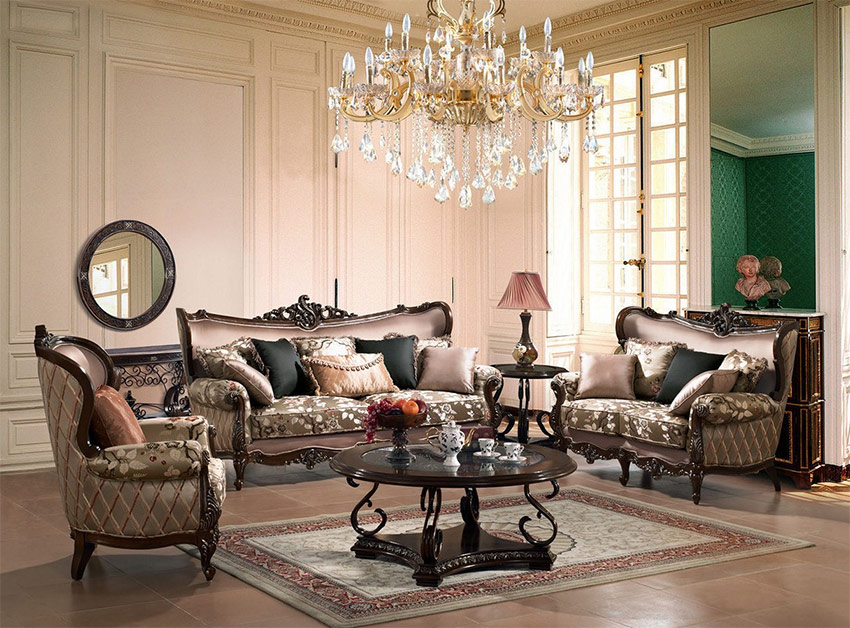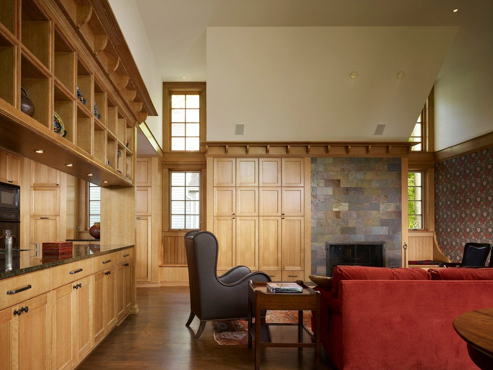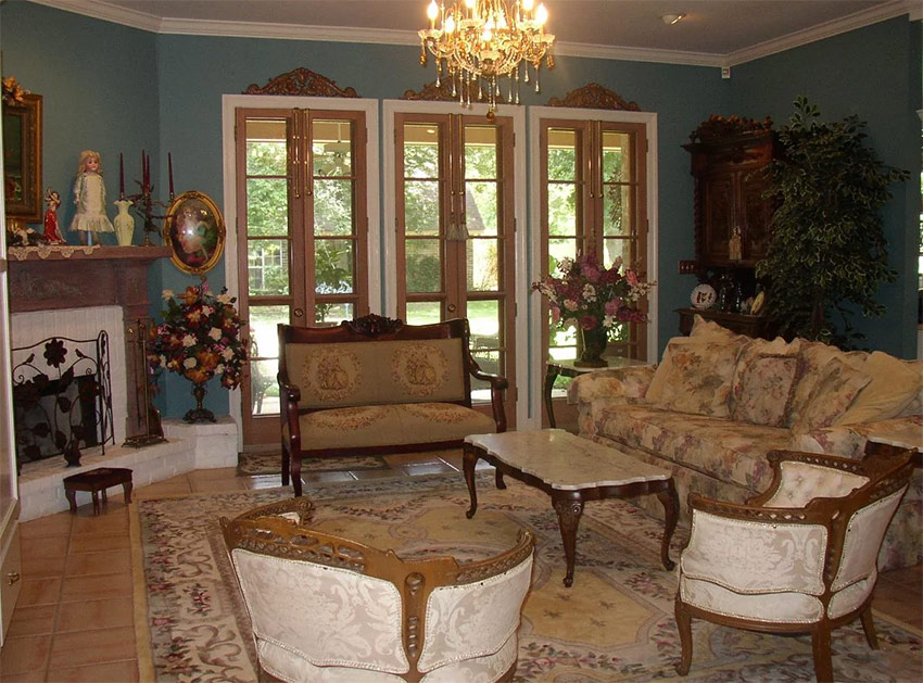 Des fauteuils moelleux avec des «oreilles», des armoires avec de petits vitraux (vitraux), des canapés avec accoudoirs ronds et une abondance d'oreillers sont typiques de la vie quotidienne.