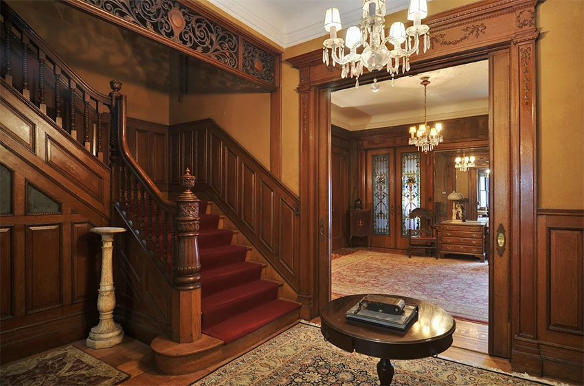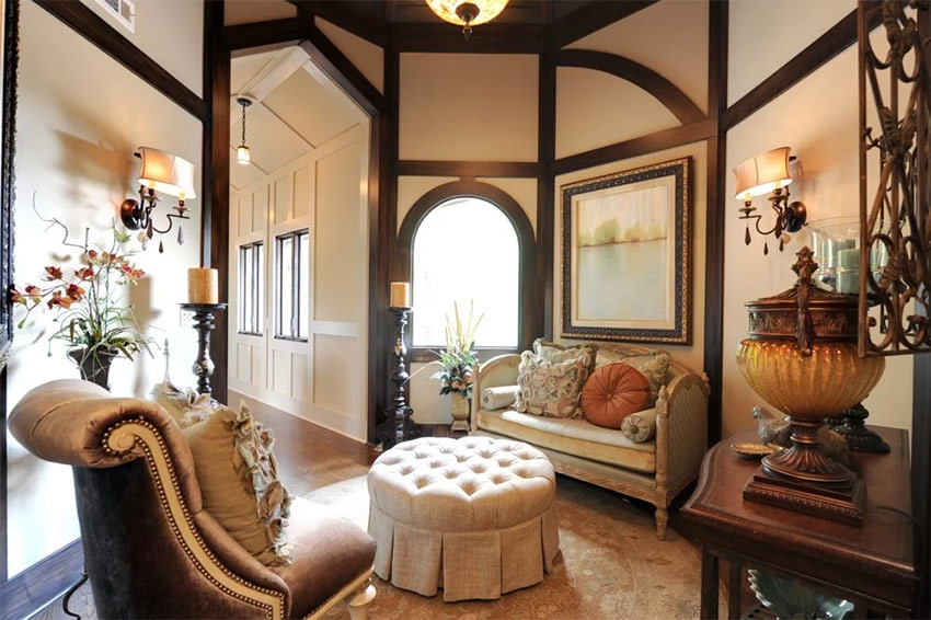 Le principe principal auquel obéissent toute la décoration intérieure et l'agencement des pièces est la symétrie. Portes dans les couloirs, fenêtres, chambres - tout est situé symétriquement. Comme mentionné ci-dessus, les maisons anglaises se distinguent souvent par la présence de petites pièces. Mais en même temps, ils peuvent avoir deux étages. Un bel escalier dans le salon menant au deuxième étage n'est pas seulement un signe caractéristique de style, mais aussi un élément important dans la division de l'espace.