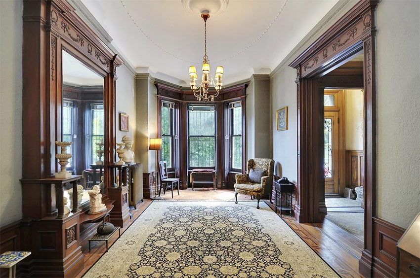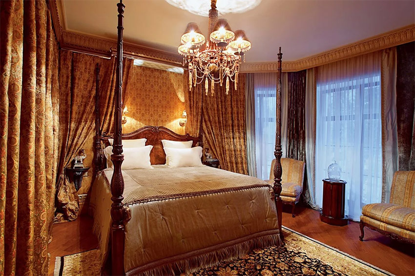 Pour une note. L'utilisation de couleurs sombres et atténuées pour décorer les pièces est une caractéristique typique. Dans le même temps, cette règle fonctionne: les chambres donnant sur le côté sud sont décorées dans des tons verts, bleus et gris froids, et celles qui font face au côté nord sont visuellement plus chaudes et plus confortables à l'aide de couleurs chaudes - chocolat, ocre, cramoisi, sable.
