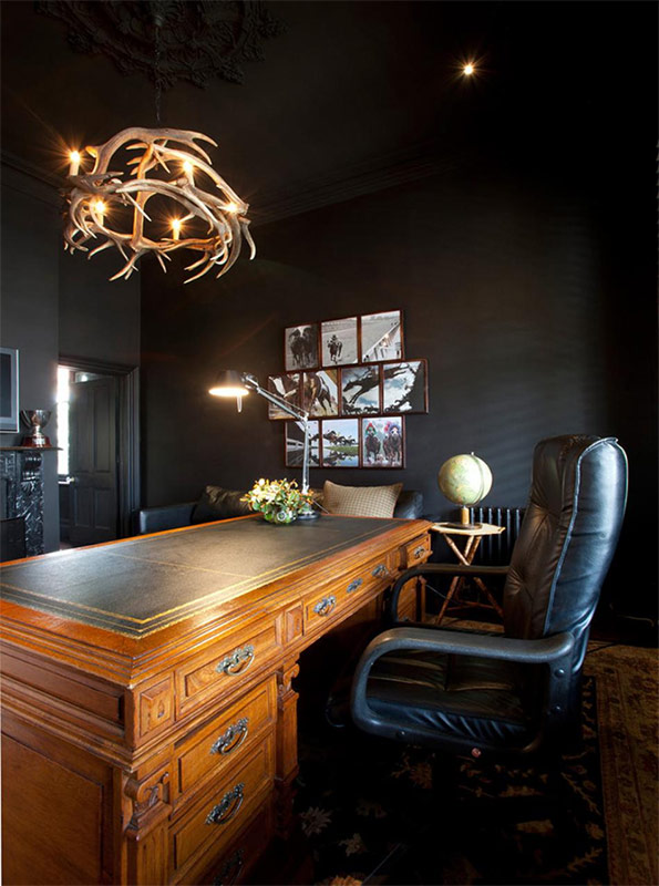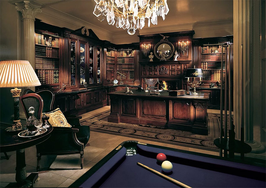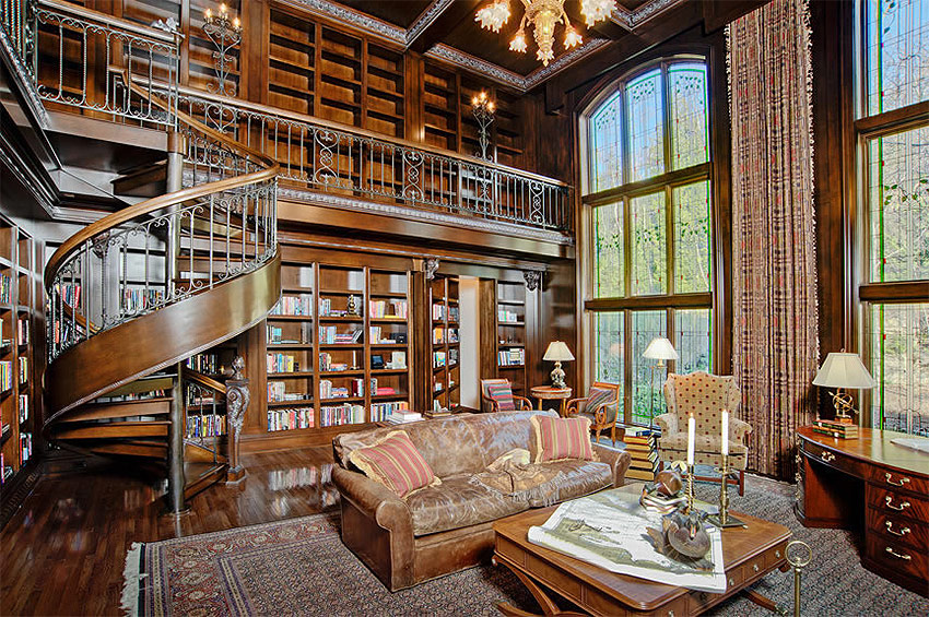 #2. Ceux qui aiment lire des livres en papier naturel dans un fauteuil confortable devant la cheminée, car la maison anglaise doit avoir une bibliothèque à domicile. Et indépendamment de sa taille, de la quantité et du contenu des livres, c'est à la fois un lieu de repos et une étude. Les livres sont placés dans de grandes armoires en bois équipées d'une échelle (afin d'obtenir facilement n'importe quel livre). De plus, les bibliothèques sont équipées d'un bureau massif et d'un fauteuil confortable avec un lampadaire sur pied.