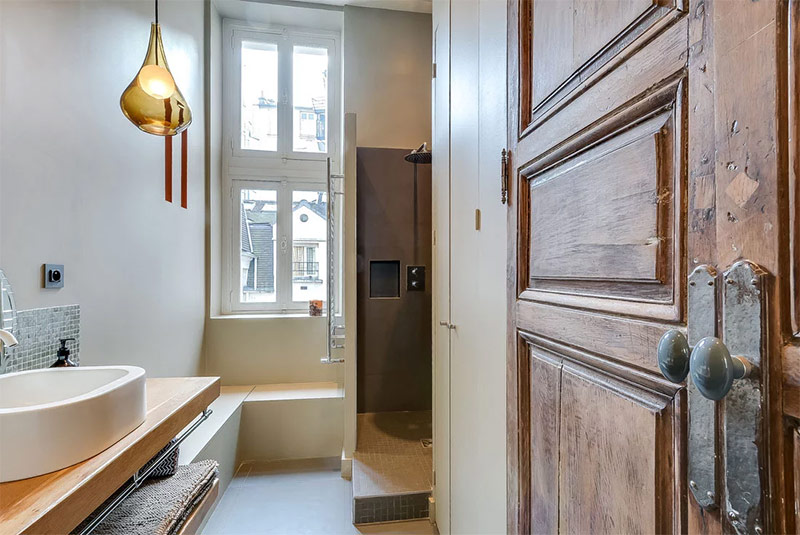 Vieilles portes en bois complétant les nouveaux accessoires de salle de bain.