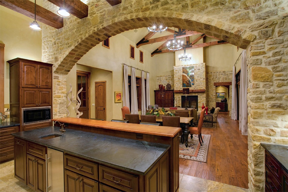 Ces murs intérieurs peuvent facilement vous faire croire que vous êtes dans une maison en pierre. Cependant, ce n'est qu'une cloison sèche et la pierre est en fait du placage de calcaire. Comme vous pouvez le voir, la pierre décorative à l'intérieur du salon fait face aux fonctions qui lui sont assignées pas pire que naturelle!