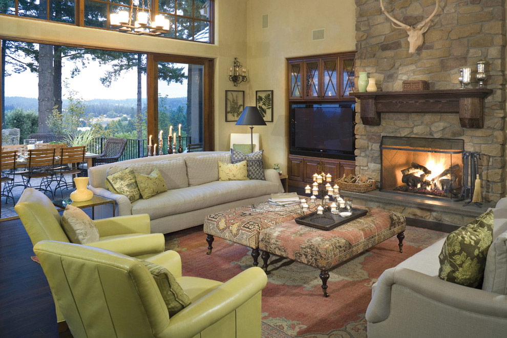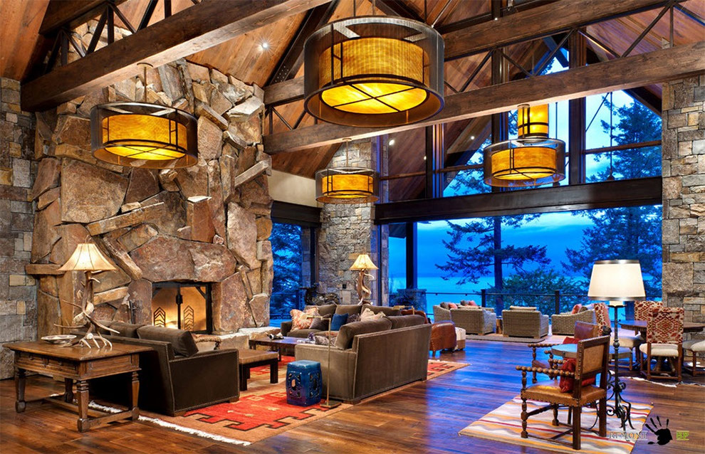 Un rebord de pierre multicolore s'étend du sol au plafond dans ce salon. Cependant, ce mur n'est pas fini avec de la pierre, mais avec du placage de pierre. Si vous prévoyez de plaquer le mur du foyer au plafond, pensez à un tel remplacement - le travail sera beaucoup plus facile et plus rapide.