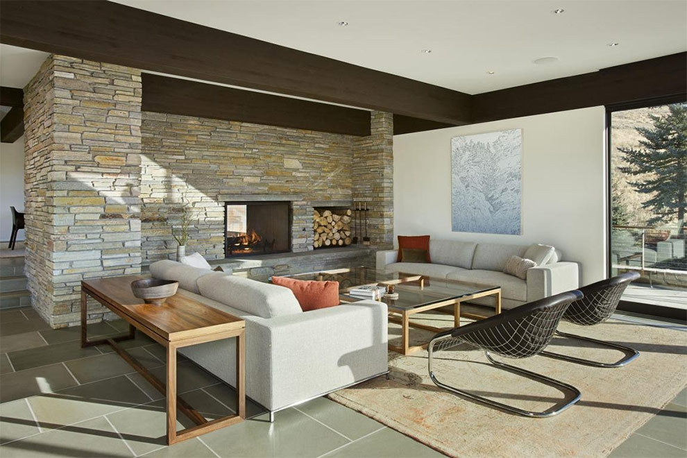 Lorsque vous utilisez un matériau de finition rugueux comme la pierre, n'oubliez pas de «réchauffer» l'espace à l'aide de tissus d'ameublement, de tapis, d'oreillers et de la palette de couleurs générale de la pièce. Dans ce salon, le designer a utilisé des tissus d'ameublement doux, un grand tapis en laine et une abondance d'oreillers pour créer une atmosphère chaleureuse.